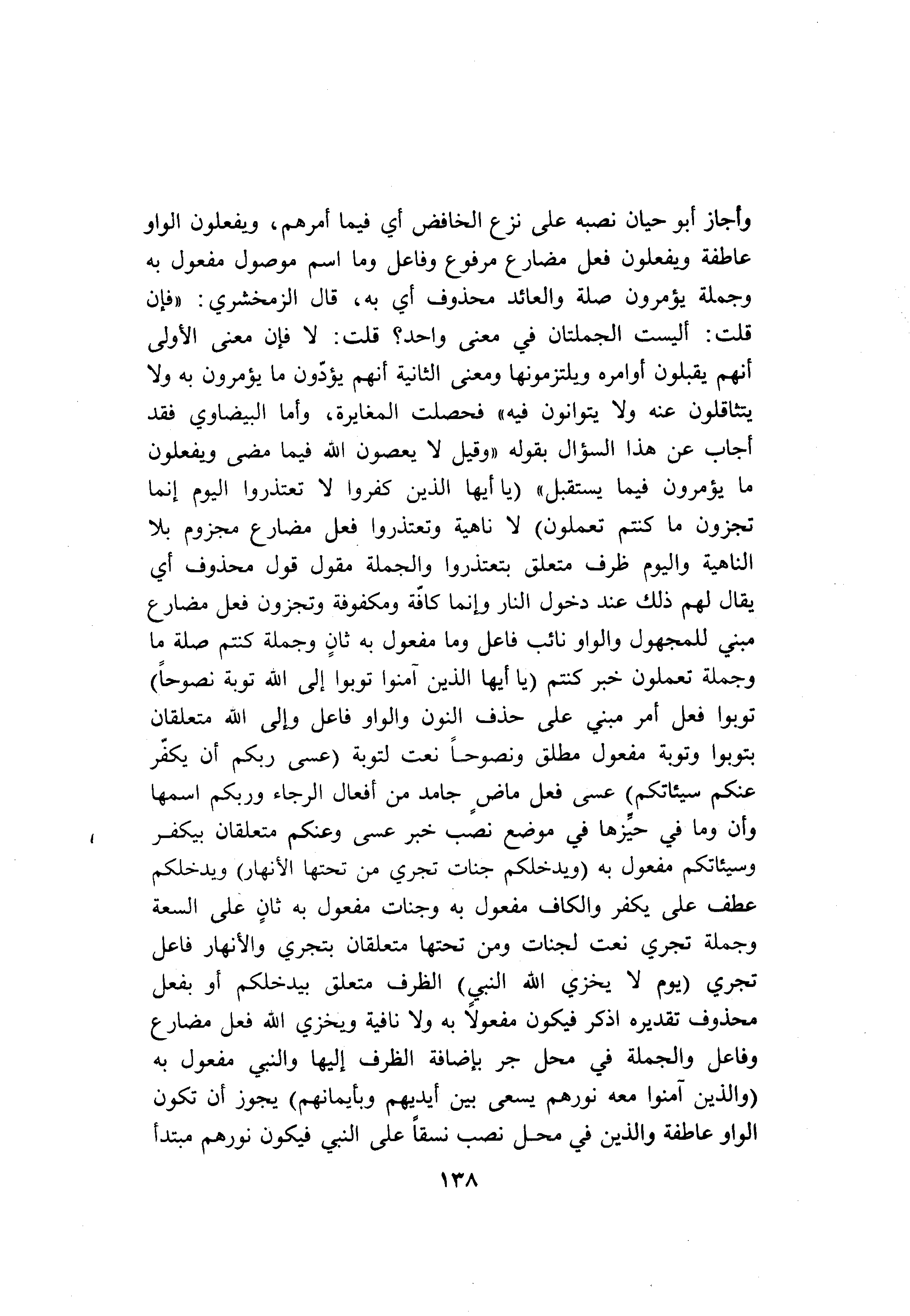 وأجاز أبو حيان نصبه على نزع الخافض أي فيما أمرهم، ويفعلون الواو عاطفة ويفعلون فعل مضارع مرفوع وفاعل وما اسم موصول مفعول به وجملة يؤمرون صلة والعائد محذوف أي به، قال الزمخشري: «فإن قلت: أليست الجملتان في معنى واحد؟ قلت: لا فإن معنى الأولى أنهم يقبلون أوامره ويلتزمونها ومعنى الثانية أنهم يؤدّون ما يؤمرون به ولا يتثاقلون عنه ولا يتوانون فيه» فحصلت المغايرة، وأما البيضاوي فقد أجاب عن هذا السؤال بقوله «وقيل لا يعصون الله فيما مضى ويفعلون ما يؤمرون فيما يستقبل» (يا أَيُّهَا الَّذِينَ كَفَرُوا لا تَعْتَذِرُوا الْيَوْمَ إِنَّما تُجْزَوْنَ ما كُنْتُمْ تَعْمَلُونَ) لا ناهية وتعتذروا فعل مضارع مجزوم بلا الناهية واليوم ظرف متعلق بتعتذروا والجملة مقول قول محذوف أي يقال لهم ذلك عند دخول النار وإنما كافّة ومكفوفة وتجزون فعل مضارع مبني للمجهول والواو نائب فاعل وما مفعول به ثان وجملة كنتم صلة ما وجملة تعملون خبر كنتم (يا أَيُّهَا الَّذِينَ آمَنُوا تُوبُوا إِلَى اللَّهِ تَوْبَةً نَصُوحاً) توبوا فعل أمر مبني على حذف النون والواو فاعل وإلى الله متعلقان بتوبوا وتوبة مفعول مطلق ونصوحا نعت لتوبة (عَسى رَبُّكُمْ أَنْ يُكَفِّرَ عَنْكُمْ سَيِّئاتِكُمْ) عسى فعل ماض جامد من أفعال الرجاء وربكم اسمها وأن وما في حيّزها في موضع نصب خبر عسى وعنكم متعلقان بيكفر وسيئاتكم مفعول به (وَيُدْخِلَكُمْ جَنَّاتٍ تَجْرِي مِنْ تَحْتِهَا الْأَنْهارُ) ويدخلكم عطف على يكفر والكاف مفعول به وجنات مفعول به ثان على السعة وجملة تجري نعت لجنات ومن تحتها متعلقان بتجري والأنهار فاعل تجري (يَوْمَ لا يُخْزِي اللَّهُ النَّبِيَّ) الظرف متعلق بيدخلكم أو بفعل محذوف تقديره اذكر فيكون مفعولا به ولا نافية ويخزي الله فعل مضارع وفاعل والجملة في محل جر بإضافة الظرف إليها والنبي مفعول به (وَالَّذِينَ آمَنُوا مَعَهُ نُورُهُمْ يَسْعى بَيْنَ أَيْدِيهِمْ وَبِأَيْمانِهِمْ) يجوز أن تكون الواو عاطفة والذين في محل نصب نسقا على النبي فيكون نورهم مبتدأ