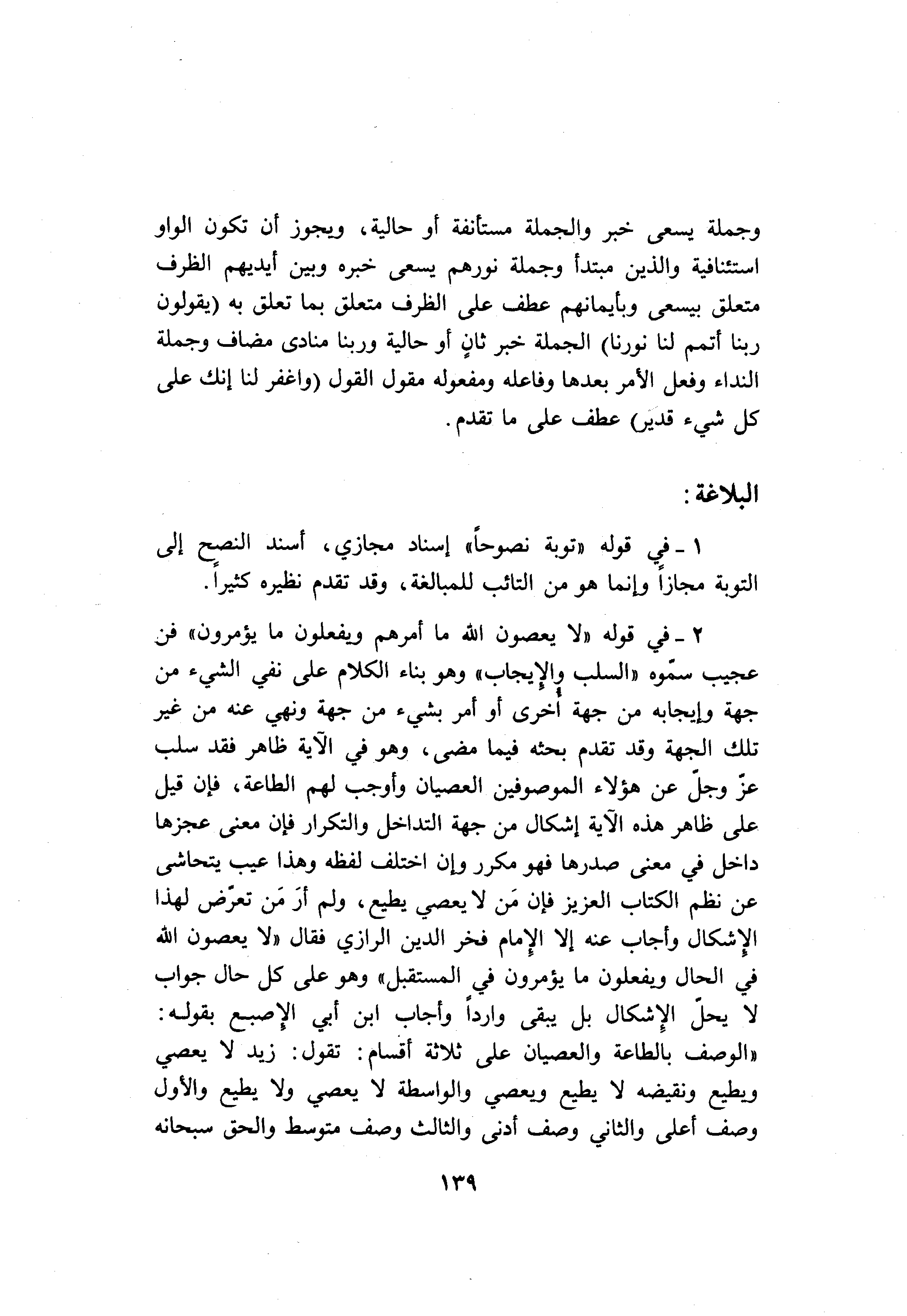 2- في قوله «لا يعصون الله ما أمرهم ويفعلون ما يؤمرون» فن عجيب سمّوه «السلب والإيجاب» وهو بناء الكلام على نفي الشيء من جهة وإيجابه من جهة أخرى أو أمر بشيء من جهة ونهي عنه من غير تلك الجهة وقد تقدم بحثه فيما مضى، وهو في الآية ظاهر فقد سلب عزّ وجلّ عن هؤلاء الموصوفين العصيان وأوجب لهم الطاعة، فإن قيل على ظاهر هذه الآية إشكال من جهة التداخل والتكرار فإن معنى عجزها داخل في معنى صدرها فهو مكرر وإن اختلف لفظه وهذا عيب يتحاشى عن نظم الكتاب العزيز فإن من لا يعصي يطيع، ولم أر من تعرّض لهذا الإشكال وأجاب عنه إلا الإمام فخر الدين الرازي فقال «لا يعصون الله في الحال ويفعلون ما يؤمرون في المستقبل» وهو على كل حال جواب لا يحلّ الإشكال بل يبقى واردا وأجاب ابن أبي الإصبع بقوله:
