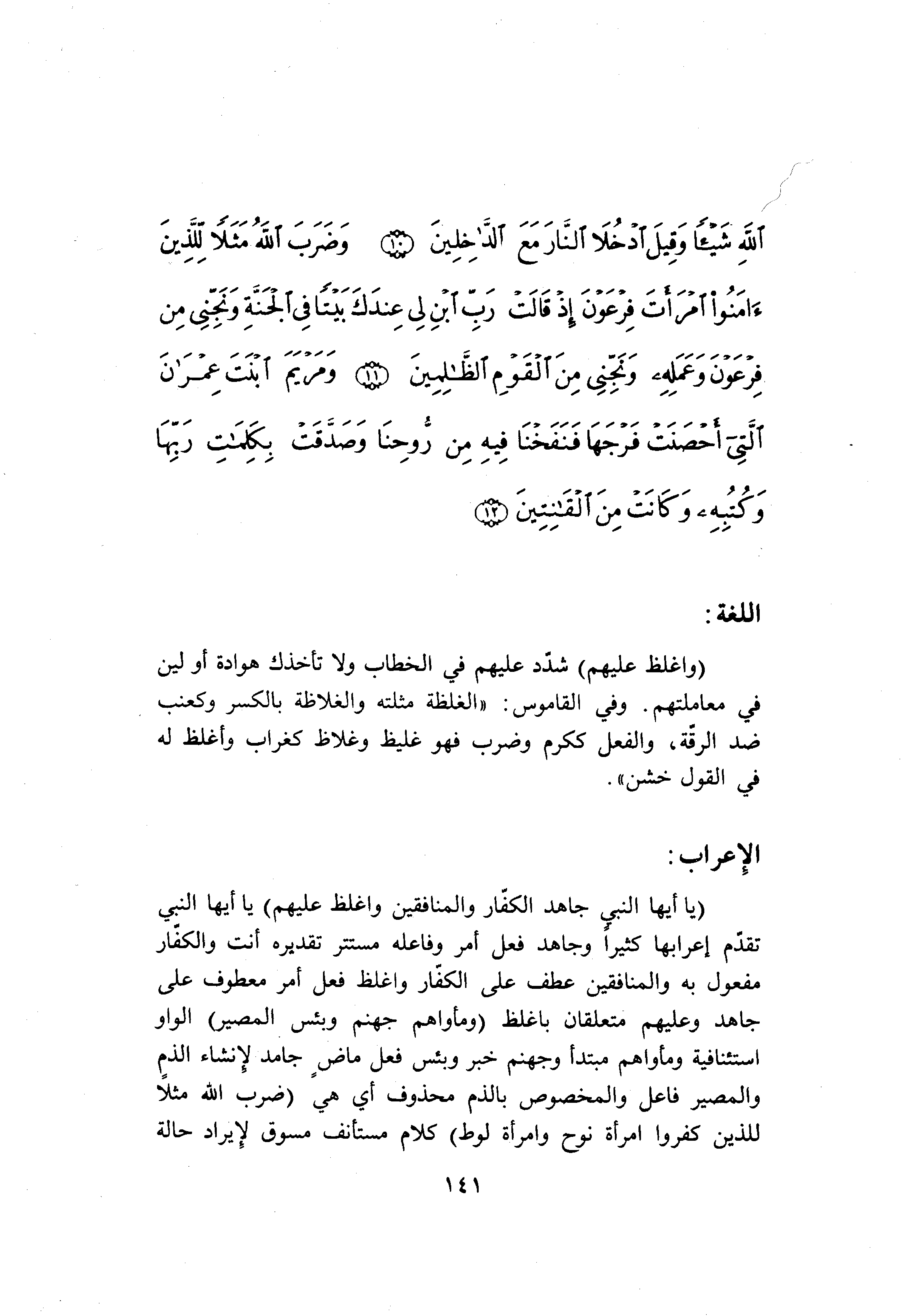 (يا أَيُّهَا النَّبِيُّ جاهِدِ الْكُفَّارَ وَالْمُنافِقِينَ وَاغْلُظْ عَلَيْهِمْ) يا أيها النبي تقدّم إعرابها كثيرا وجاهد فعل أمر وفاعله مستتر تقديره أنت والكفّار مفعول به والمنافقين عطف على الكفّار واغلظ فعل أمر معطوف على جاهد وعليهم متعلقان بأغلظ (وَمَأْواهُمْ جَهَنَّمُ وَبِئْسَ الْمَصِيرُ) الواو استئنافية ومأواهم مبتدأ وجهنم خبر وبئس فعل ماض جامد لإنشاء الذم والمصير فاعل والمخصوص بالذم محذوف أي هي (ضَرَبَ اللَّهُ مَثَلًا لِلَّذِينَ كَفَرُوا امْرَأَتَ نُوحٍ وَامْرَأَتَ لُوطٍ) كلام مستأنف مسوق لإيراد حالة