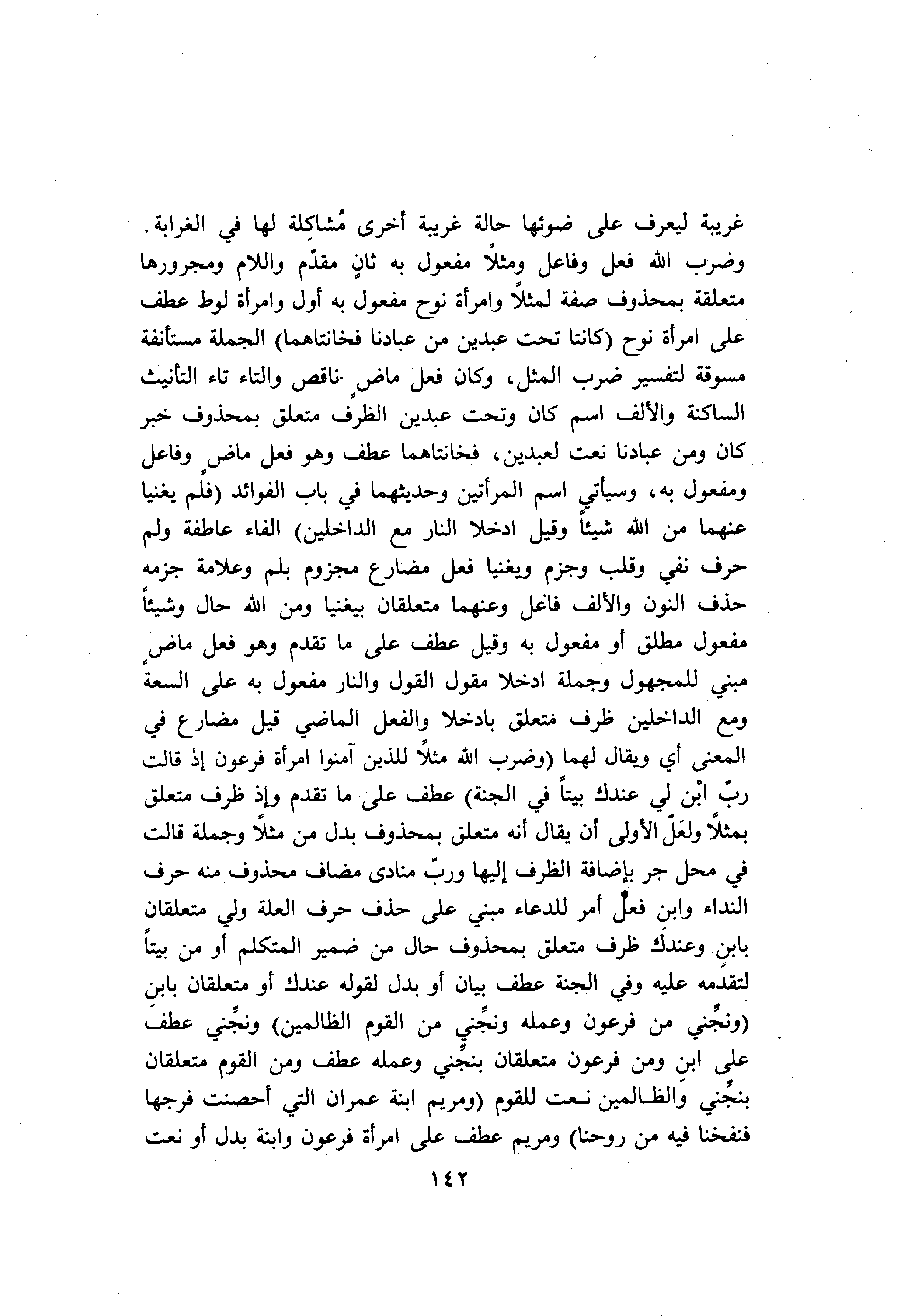وضرب الله فعل وفاعل ومثلا مفعول به ثان مقدّم واللام ومجرورها متعلقة بمحذوف صفة لمثلا وامرأة نوح مفعول به أول وامرأة لوط عطف على امرأة نوح (كانَتا تَحْتَ عَبْدَيْنِ مِنْ عِبادِنا صالِحَيْنِ فَخانَتاهُما) الجملة مستأنفة مسوقة لتفسير ضرب المثل، وكان فعل ماض ناقص والتاء تاء التأنيث الساكنة والألف اسم كان وتحت عبدين الظرف متعلق بمحذوف خبر كان ومن عبادنا نعت لعبدين، فخانتاهما عطف وهو فعل ماض وفاعل ومفعول به، وسيأتي اسم المرأتين وحديثهما في باب الفوائد (فَلَمْ يُغْنِيا عَنْهُما مِنَ اللَّهِ شَيْئاً وَقِيلَ ادْخُلَا النَّارَ مَعَ الدَّاخِلِينَ) الفاء عاطفة ولم حرف نفي وقلب وجزم ويغنيا فعل مضارع مجزوم بلم وعلامة جزمه حذف النون والألف فاعل وعنهما متعلقان بيغنيا ومن الله حال وشيئا مفعول مطلق أو مفعول به وقيل عطف على ما تقدم وهو فعل ماض مبني للمجهول وجملة ادخلا مقول القول والنار مفعول به على السعة ومع الداخلين ظرف متعلق بادخلا والفعل الماضي قيل مضارع في المعنى أي ويقال لهما (وَضَرَبَ اللَّهُ مَثَلًا لِلَّذِينَ آمَنُوا امْرَأَتَ فِرْعَوْنَ إِذْ قالَتْ رَبِّ ابْنِ لِي عِنْدَكَ بَيْتاً فِي الْجَنَّةِ) عطف على ما تقدم وإذ ظرف متعلق بمثلا ولعلّ الأولى أن يقال أنه متعلق بمحذوف بدل من مثلا وجملة قالت في محل جر بإضافة الظرف إليها وربّ منادى مضاف محذوف منه حرف النداء وابن فعل أمر للدعاء مبني على حذف حرف العلة ولي متعلقان بابن وعندك ظرف متعلق بمحذوف حال من ضمير المتكلم أو من بيتا لتقدمه عليه وفي الجنة عطف بيان أو بدل لقوله عندك أو متعلقان بابن (وَنَجِّنِي مِنْ فِرْعَوْنَ وَعَمَلِهِ وَنَجِّنِي مِنَ الْقَوْمِ الظَّالِمِينَ) ونجّني عطف على ابن ومن فرعون متعلقان بنجّني وعمله عطف ومن القوم متعلقان بنجّني والظالمين نعت للقوم (وَمَرْيَمَ ابْنَتَ عِمْرانَ الَّتِي أَحْصَنَتْ فَرْجَها فَنَفَخْنا فِيهِ مِنْ رُوحِنا) ومريم عطف على امرأة فرعون وابنة بدل أو نعت