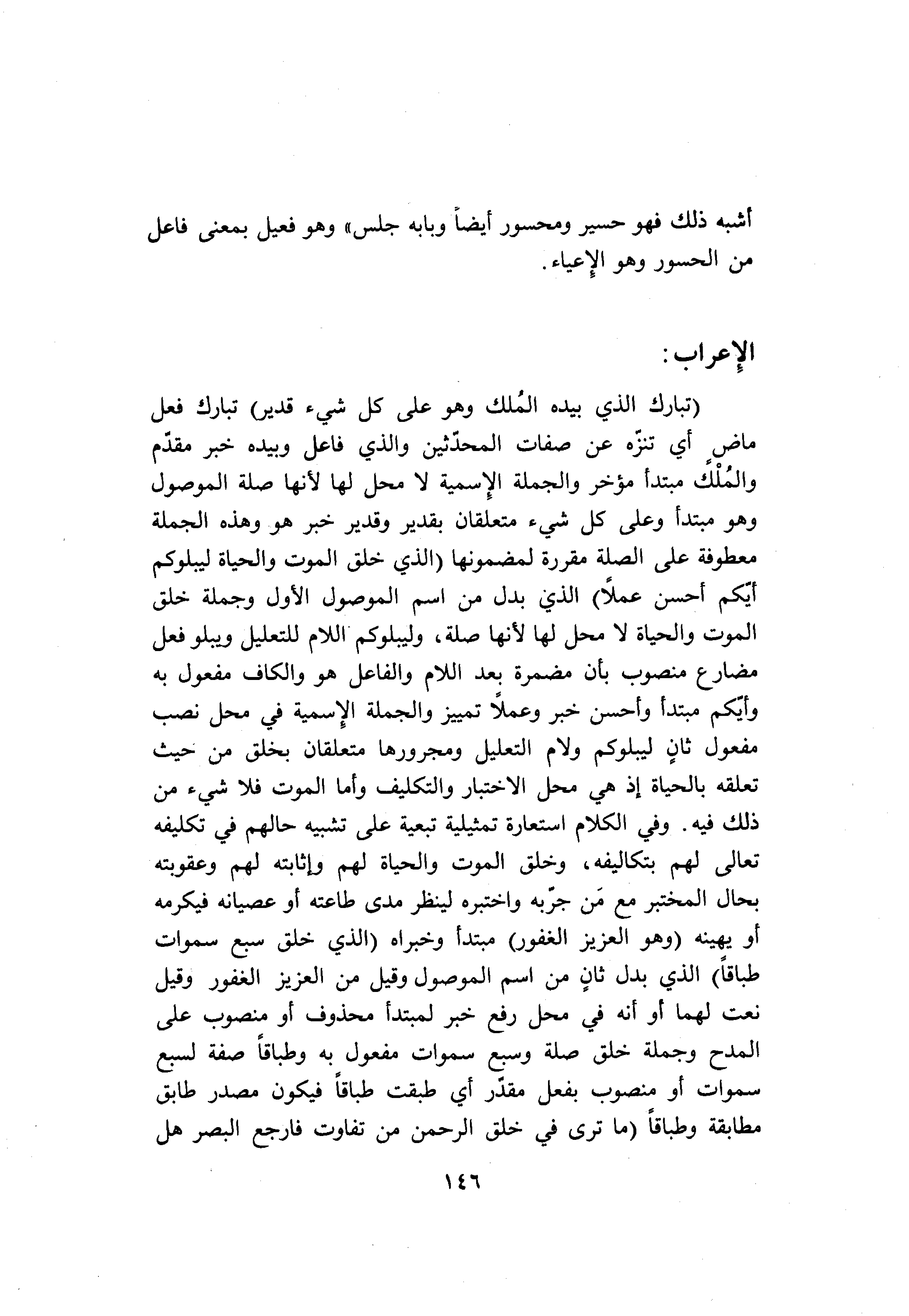 (تَبارَكَ الَّذِي بِيَدِهِ الْمُلْكُ وَهُوَ عَلى كُلِّ شَيْءٍ قَدِيرٌ) تبارك فعل ماض أي تنزّه عن صفات المحدّثين والذي فاعل وبيده خبر مقدّم والملك مبتدأ مؤخر والجملة الاسمية لا محل لها لأنها صلة الموصول وهو مبتدأ وعلى كل شيء متعلقان بقدير وقدير خبر هو وهذه الجملة معطوفة على الصلة مقررة لمضمونها (الَّذِي خَلَقَ الْمَوْتَ وَالْحَياةَ لِيَبْلُوَكُمْ أَيُّكُمْ أَحْسَنُ عَمَلًا) الذي بدل من اسم الموصول الأول وجملة خلق الموت والحياة لا محل لها لأنها صلة، وليبلوكم اللام للتعليل ويبلو فعل مضارع منصوب بأن مضمرة بعد اللام والفاعل هو والكاف مفعول به وأيّكم مبتدأ وأحسن خبر وعملا تمييز والجملة الاسمية في محل نصب مفعول ثان ليبلوكم ولام التعليل ومجرورها متعلقان بخلق من حيث تعلقه بالحياة إذ هي محل الاختبار والتكليف وأما الموت فلا شيء من ذلك فيه. وفي الكلام استعارة تمثيلية تبعية على تشبيه حالهم في تكليفه تعالى لهم بتكاليفه، وخلق الموت والحياة لهم وإثابته لهم وعقوبته بحال المختبر مع من جرّبه واختبره لينظر مدى طاعته أو عصيانه فيكرمه أو يهينه (وَهُوَ الْعَزِيزُ الْغَفُورُ) مبتدأ وخبراه (الَّذِي خَلَقَ سَبْعَ سَماواتٍ طِباقاً) الذي بدل ثان من اسم الموصول وقيل من العزيز الغفور وقيل نعت لهما أو أنه في محل رفع خبر لمبتدأ محذوف أو منصوب على المدح وجملة خلق صلة وسبع سموات مفعول به وطباقا صفة لسبع سموات أو منصوب بفعل مقدّر أي طبقت طباقا فيكون مصدر طابق مطابقة وطباقا (ما تَرى فِي خَلْقِ الرَّحْمنِ مِنْ تَفاوُتٍ فَارْجِعِ الْبَصَرَ هَلْ تَرى مِنْ فُطُورٍ)