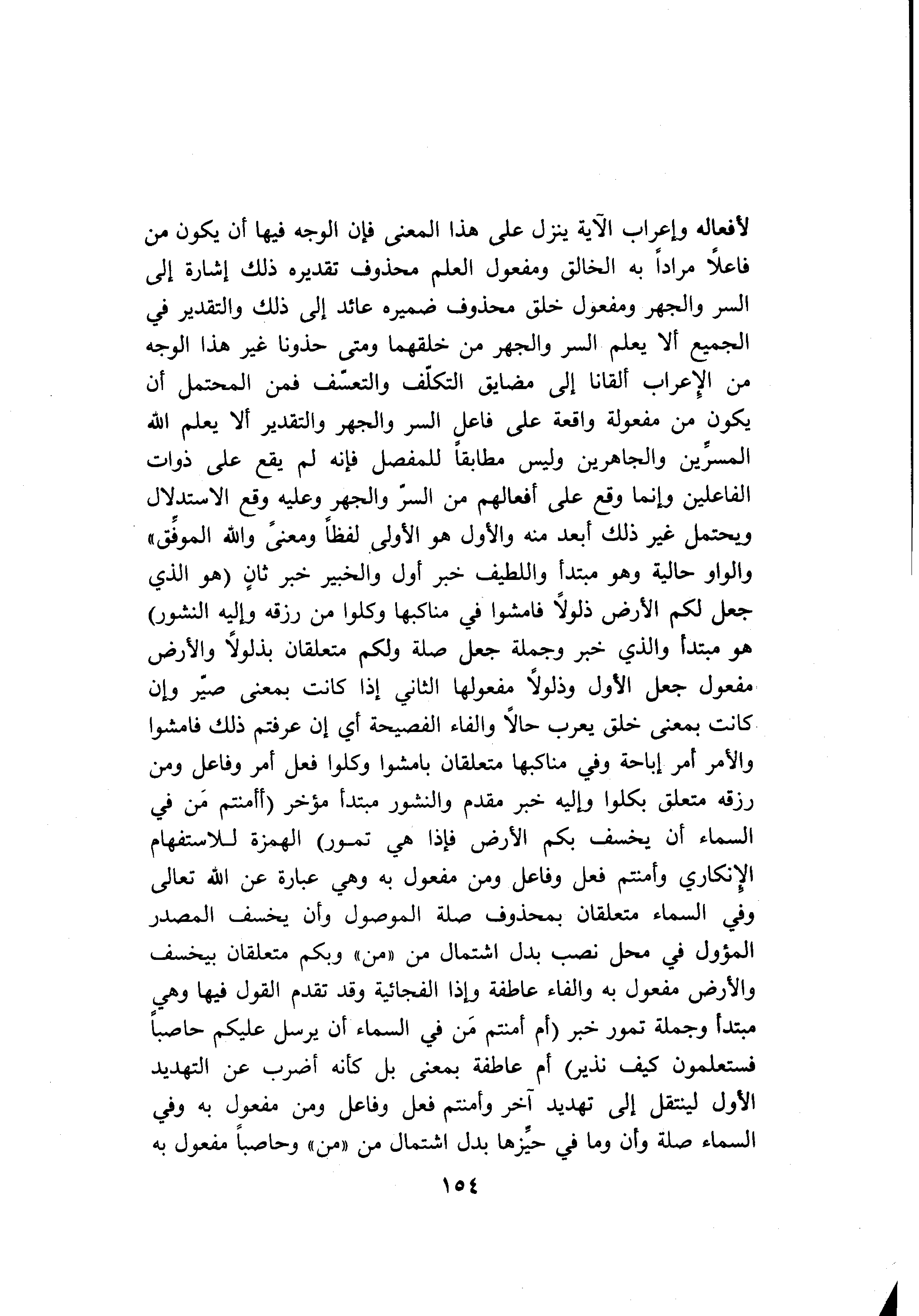 لأفعاله وإعراب الآية ينزل على هذا المعنى فإن الوجه فيها أن يكون من فاعلا مرادا به الخالق ومفعول العلم محذوف تقديره ذلك إشارة إلى السر والجهر ومفعول خلق محذوف ضميره عائد إلى ذلك والتقدير في الجميع ألا يعلم السر والجهر من خلقهما ومتى حذونا غير هذا الوجه من الإعراب ألقانا إلى مضايق التكلّف والتعسّف فمن المحتمل أن يكون من مفعولة واقعة على فاعل السر والجهر والتقدير ألا يعلم الله المسرّين والجاهرين وليس مطابقا للمفصل فإنه لم يقع على ذوات الفاعلين وإنما وقع على أفعالهم من السرّ والجهر وعليه وقع الاستدلال ويحتمل غير ذلك أبعد منه والأول هو الأولى لفظا ومعنى والله الموفّق» والواو حالية وهو مبتدأ واللطيف خبر أول والخبير خبر ثان (هُوَ الَّذِي جَعَلَ لَكُمُ الْأَرْضَ ذَلُولًا فَامْشُوا فِي مَناكِبِها وَكُلُوا مِنْ رِزْقِهِ وَإِلَيْهِ النُّشُورُ) هو مبتدأ والذي خبر وجملة جعل صلة ولكم متعلقان بذلولا والأرض مفعول جعل الأول وذلولا مفعولها الثاني إذا كانت بمعنى صيّر وإن كانت بمعنى خلق يعرب حالا والفاء الفصيحة أي إن عرفتم ذلك فامشوا والأمر أمر إباحة وفي مناكبها متعلقان بامشوا وكلوا فعل أمر وفاعل ومن رزقه متعلق بكلوا وإليه خبر مقدم والنشور مبتدأ مؤخر (أَأَمِنْتُمْ مَنْ فِي السَّماءِ أَنْ يَخْسِفَ بِكُمُ الْأَرْضَ فَإِذا هِيَ تَمُورُ) الهمزة للاستفهام الإنكاري وأمنتم فعل وفاعل ومن مفعول به وهي عبارة