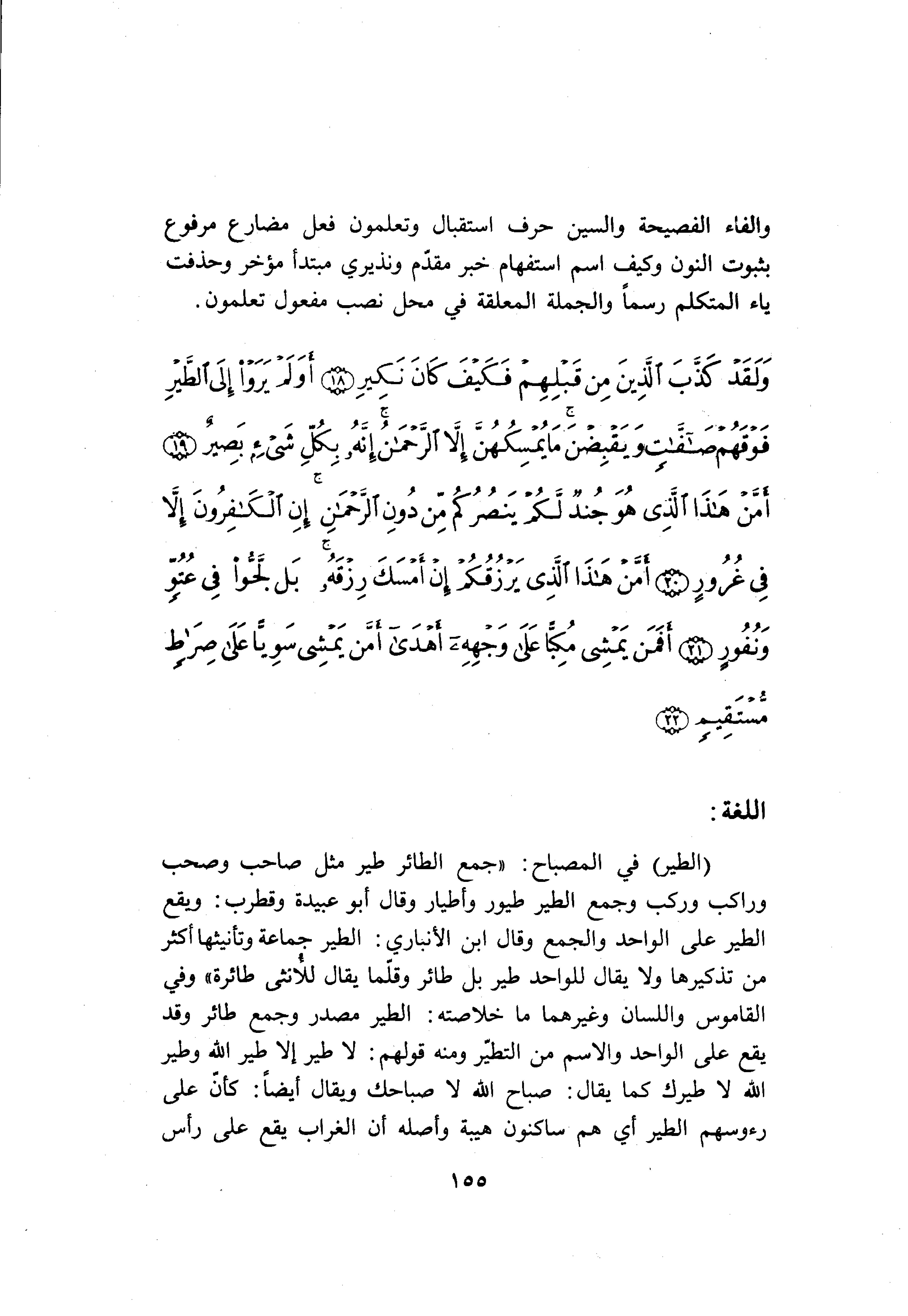 (الطَّيْرِ) في المصباح: «جمع الطائر طير مثل صاحب وصحب وراكب وركب وجمع الطير طيور وأطيار وقال أبو عبيدة وقطرب: ويقع الطير على الواحد والجمع وقال ابن الأنباري: الطير جماعة وتأنيثها أكثر من تذكيرها ولا يقال للواحد طير بل طائر وقلّما يقال للأنثى طائرة» وفي القاموس واللسان وغيرهما ما خلاصته: الطير مصدر وجمع طائر وقد يقع على الواحد والاسم من التطيّر ومنه قولهم: لا طير إلا طير الله وطير الله لا طيرك كما يقال: صباح الله لا صباحك ويقال أيضا: كأنّ على رءوسهم الطير أي هم ساكنون هيبة وأصله أن الغراب يقع على رأس