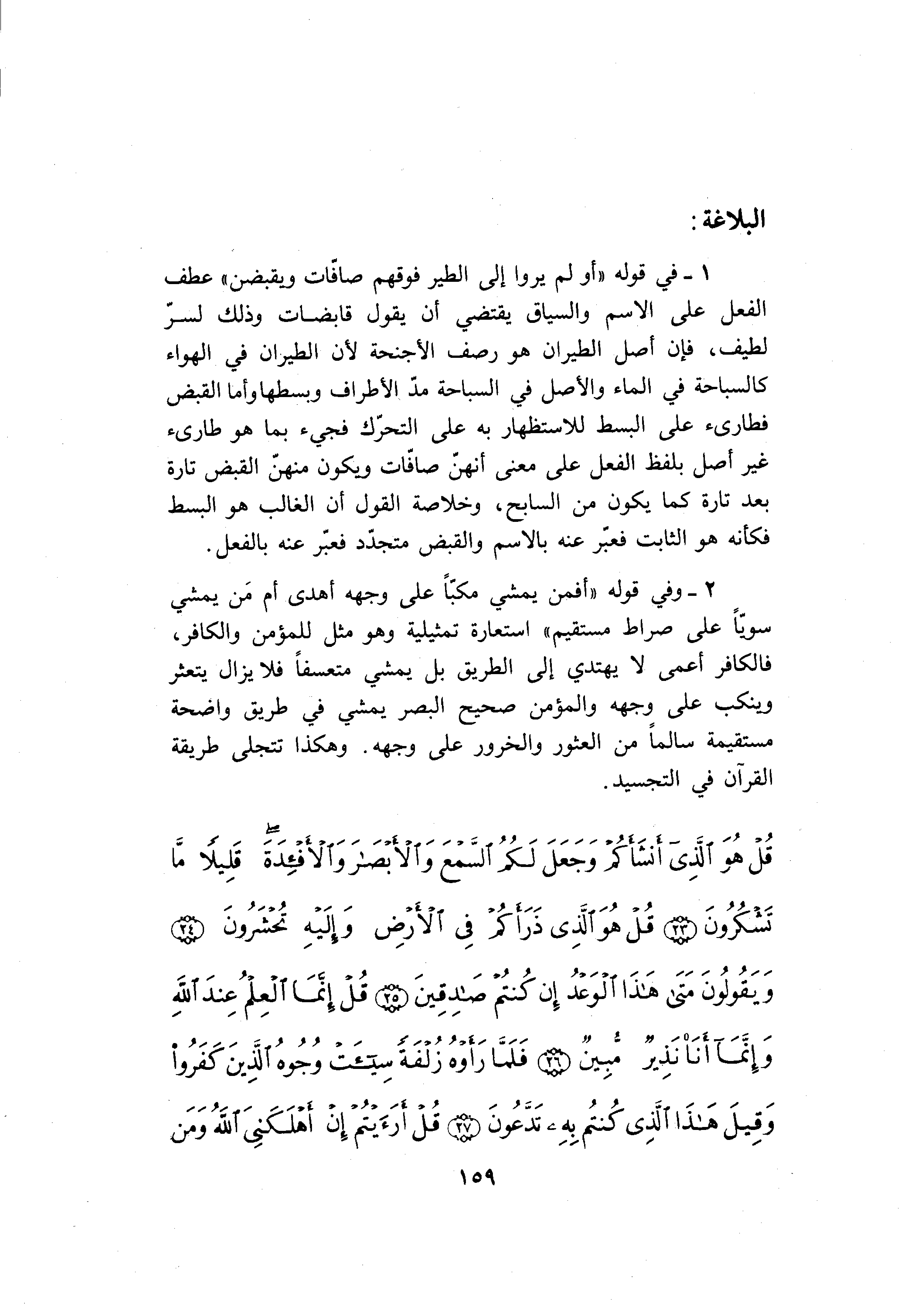 1- في قوله «أو لم يروا إلى الطير فوقهم صافّات ويقبضن» عطف الفعل على الاسم والسياق يقتضي أن يقول قابضات وذلك لسرّ لطيف، فإن أصل الطيران هو رصف الأجنحة لأن الطيران في الهواء كالسباحة في الماء والأصل في السباحة مدّ الأطراف وبسطها وأما القبض فطارىء على البسط للاستظهار به على التحرّك فجيء بما هو طارئ غير أصل بلفظ الفعل على معنى أنهنّ صافّات ويكون منهنّ القبض تارة بعد تارة كما يكون من السابح، وخلاصة القول أن الغالب هو البسط فكأنه هو الثابت فعبّر عنه بالاسم والقبض متجدّد فعبّر عنه بالفعل.