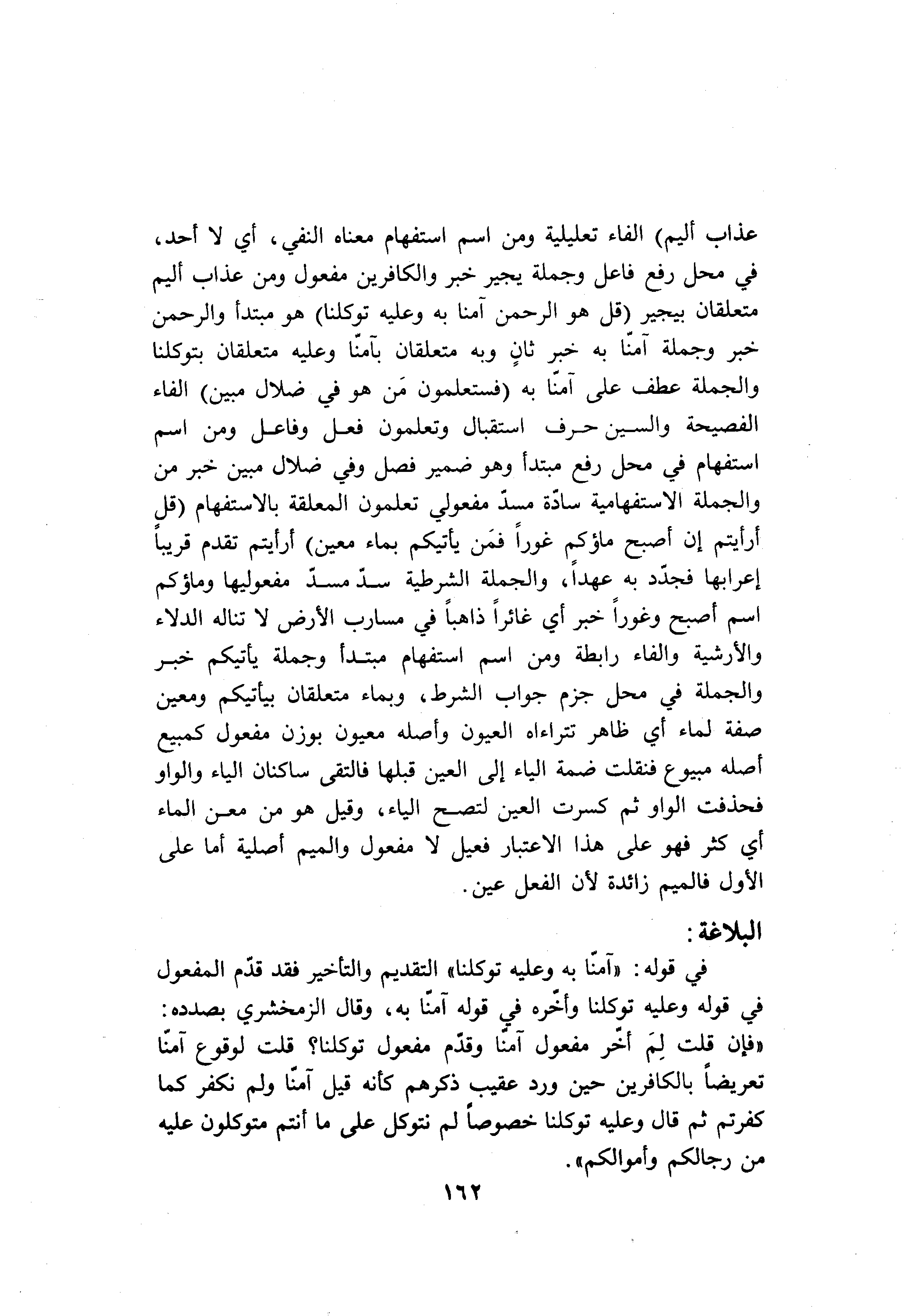 الفاء تعليلية ومن اسم استفهام معناه النفي، أي لا أحد، في محل رفع فاعل وجملة يجير خبر والكافرين مفعول ومن عذاب أليم متعلقان بيجير (قُلْ هُوَ الرَّحْمنُ آمَنَّا بِهِ وَعَلَيْهِ تَوَكَّلْنا) هو مبتدأ والرحمن خبر وجملة آمنّا به خبر ثان وبه متعلقان بآمنّا وعليه متعلقان بتوكلنا والجملة عطف على آمنّا به (فَسَتَعْلَمُونَ مَنْ هُوَ فِي ضَلالٍ مُبِينٍ) الفاء الفصيحة والسين حرف استقبال وتعلمون فعل وفاعل ومن اسم استفهام في محل رفع مبتدأ وهو ضمير فصل وفي ضلال مبين خبر من والجملة الاستفهامية سادّة مسدّ مفعولي تعلمون المعلقة بالاستفهام (قُلْ أَرَأَيْتُمْ إِنْ أَصْبَحَ ماؤُكُمْ غَوْراً فَمَنْ يَأْتِيكُمْ بِماءٍ مَعِينٍ) أرأيتم تقدم قريبا إعرابها فجدّد به عهدا، والجملة الشرطية سدّ مسدّ مفعوليها وماؤكم اسم أصبح وغورا خبر أي غائرا ذاهبا في مسارب الأرض لا تناله الدلاء والأرشية والفاء رابطة ومن اسم استفهام مبتدأ وجملة يأتيكم خبر والجملة في محل جزم جواب الشرط