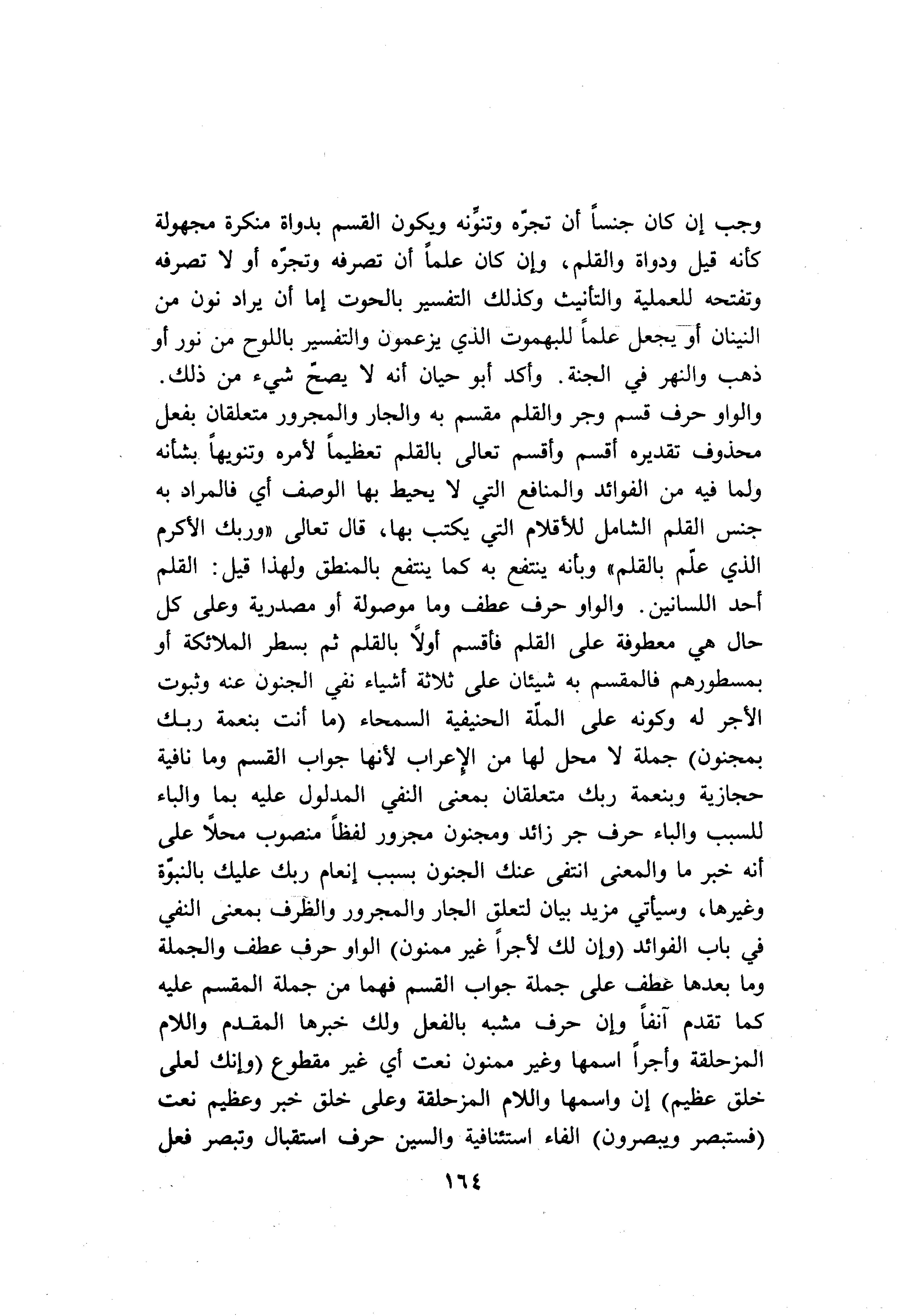 وجب إن كان جنسا أن تجرّه وتنوّنه ويكون القسم بدواة منكرة مجهولة كأنه قيل ودواة والقلم، وإن كان علما أن تصرفه وتجرّه أو لا تصرفه وتفتحه للعملية والتأنيث وكذلك التفسير بالحوت إما أن يراد نون من النينان أو يجعل علما للبهموت الذي يزعمون والتفسير باللوح من نور أو ذهب والنهر في الجنة. وأكد أبو حيان أنه لا يصحّ شيء من ذلك.