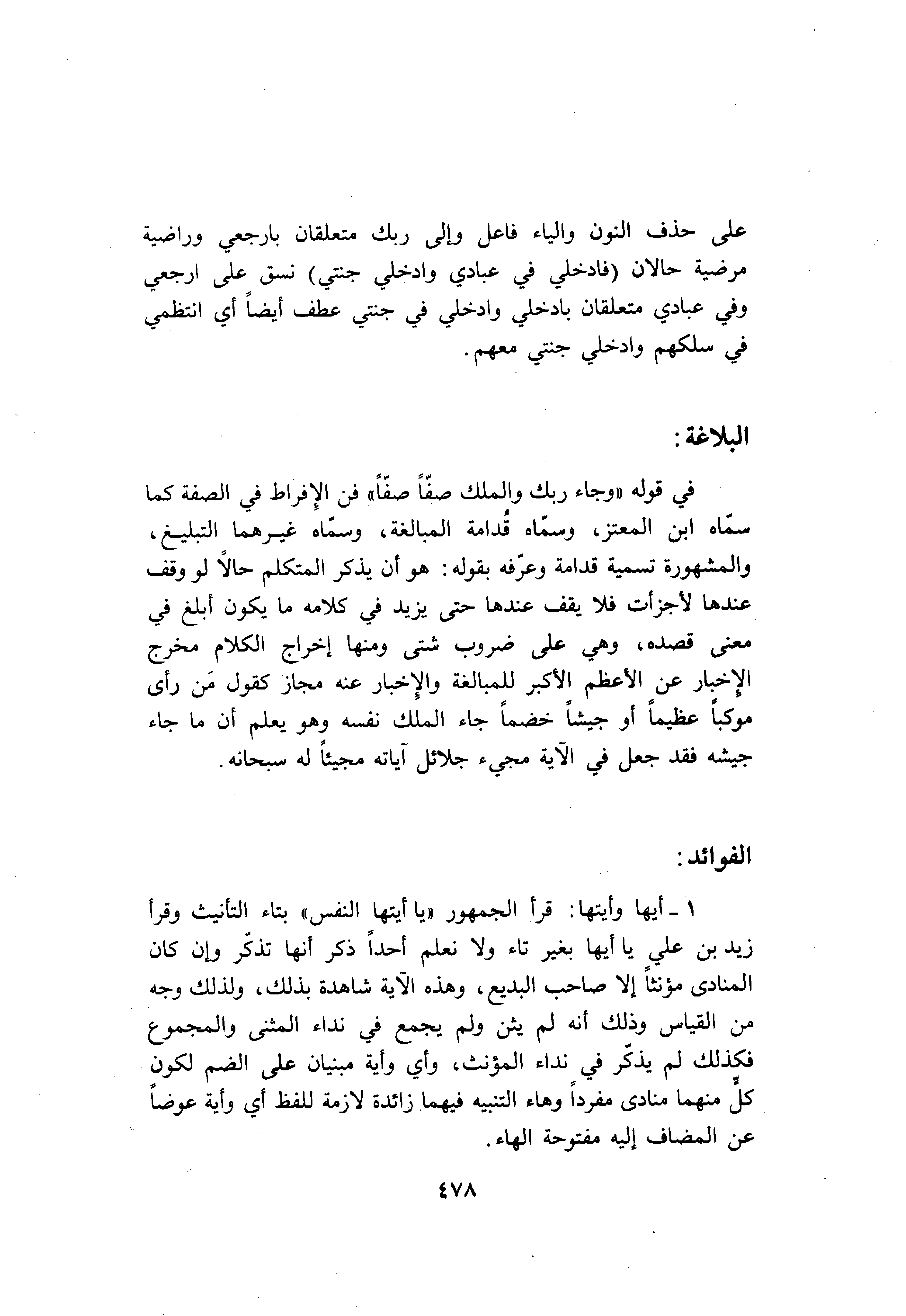 1- أيها وأيتها: قرأ الجمهور «يا أيتها النفس» بتاء التأنيث وقرأ زيد بن علي يا أيها بغير تاء ولا نعلم أحدا ذكر أنها تذكّر وإن كان المنادى مؤنثا إلا صاحب البديع، وهذه الآية شاهدة بذلك، ولذلك وجه من القياس وذلك أنه لم يثن ولم يجمع في نداء المثنى والمجموع فكذلك لم يذكّر في نداء المؤنث، وأي وأية مبنيان على الضم لكون كلّ منهما منادى مفردا وهاء التنبيه فيهما زائدة لازمة للفظ أي وأية عوضا عن المضاف إليه مفتوحة الهاء.