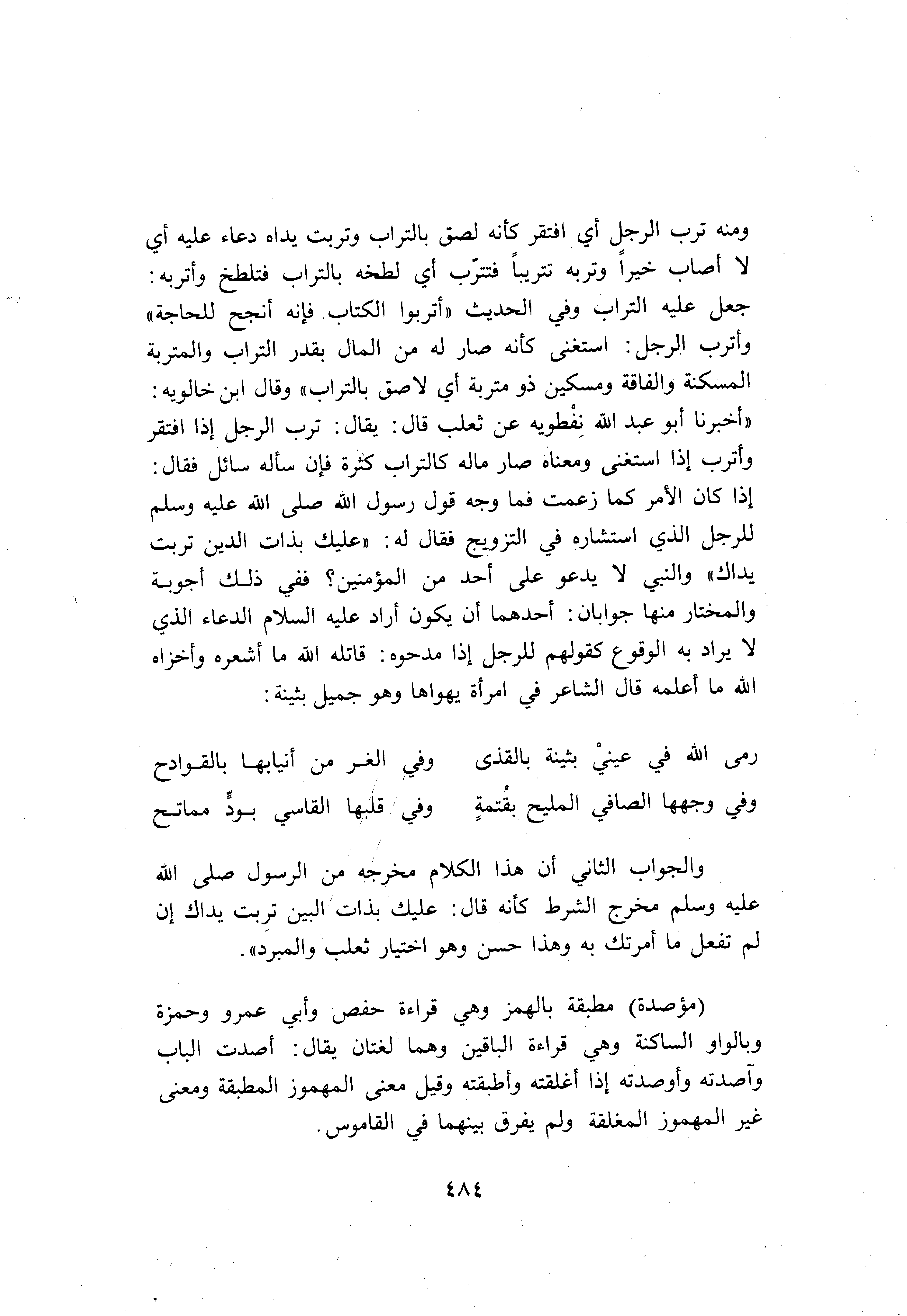 «أخبرنا أبو عبد الله نفطويه عن ثعلب قال: يقال: ترب الرجل إذا افتقر وأترب إذا استغنى ومعناه صار ماله كالتراب كثرة فإن سأله سائل فقال: