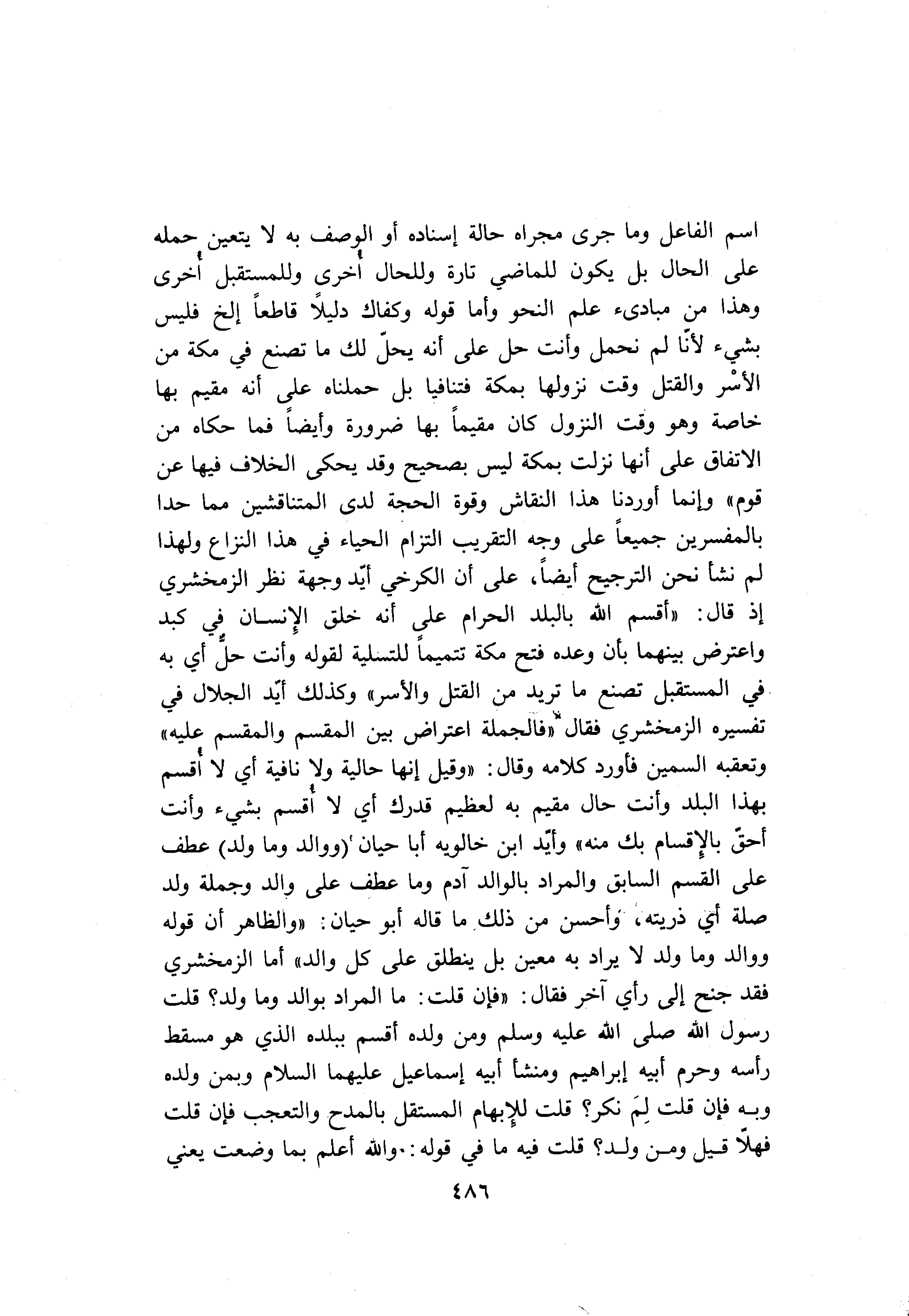 اسم الفاعل وما جرى مجراه حالة إسناده أو الوصف به لا يتعين حمله على الحال بل يكون للماضي تارة وللحال أخرى وللمستقبل أخرى وهذا من مبادئ علم النحو وأما قوله وكفاك دليلا قاطعا إلخ فليس بشيء لأنّا لم نحمل وأنت حل على أنه يحلّ لك ما تصنع في مكة من الأسر والقتل وقت نزولها بمكة فتنافيا بل حملناه على أنه مقيم بها خاصة وهو وقت النزول كان مقيما بها ضرورة وأيضا فما حكاه من الاتفاق على أنها نزلت بمكة ليس بصحيح وقد يحكى الخلاف فيها عن قوم» وإنما أوردنا هذا النقاش وقوة الحجة لدى المتناقشين مما حدا بالمفسرين جميعا على وجه التقريب التزام الحياء في هذا النزاع ولهذا لم نشأ نحن الترجيح أيضا، على أن الكرخي أيّد وجهة نظر الزمخشري إذ قال: «أقسم الله بالبلد الحرام على أنه خلق الإنسان في كبد واعترض بينهما بأن وعده فتح مكة تتميما للتسلية لقوله وأنت حلّ أي به في المستقبل تصنع ما تريد من القتل والأسر» وكذلك أيّد الجلال في تفسيره الزمخشري فقال «فالجملة اعتراض بين المقسم والمقسم عليه» وتعقبه السمين فأورد كلامه وقال: «وقيل إنها حالية ولا نافية أي لا أقسم بهذا البلد وأنت حال مقيم به لعظيم قدرك أي لا أقسم بشيء وأنت أحقّ بالإقسام بك منه» وأيّد ابن خالويه أبا حيان (وَوالِدٍ وَما وَلَدَ)