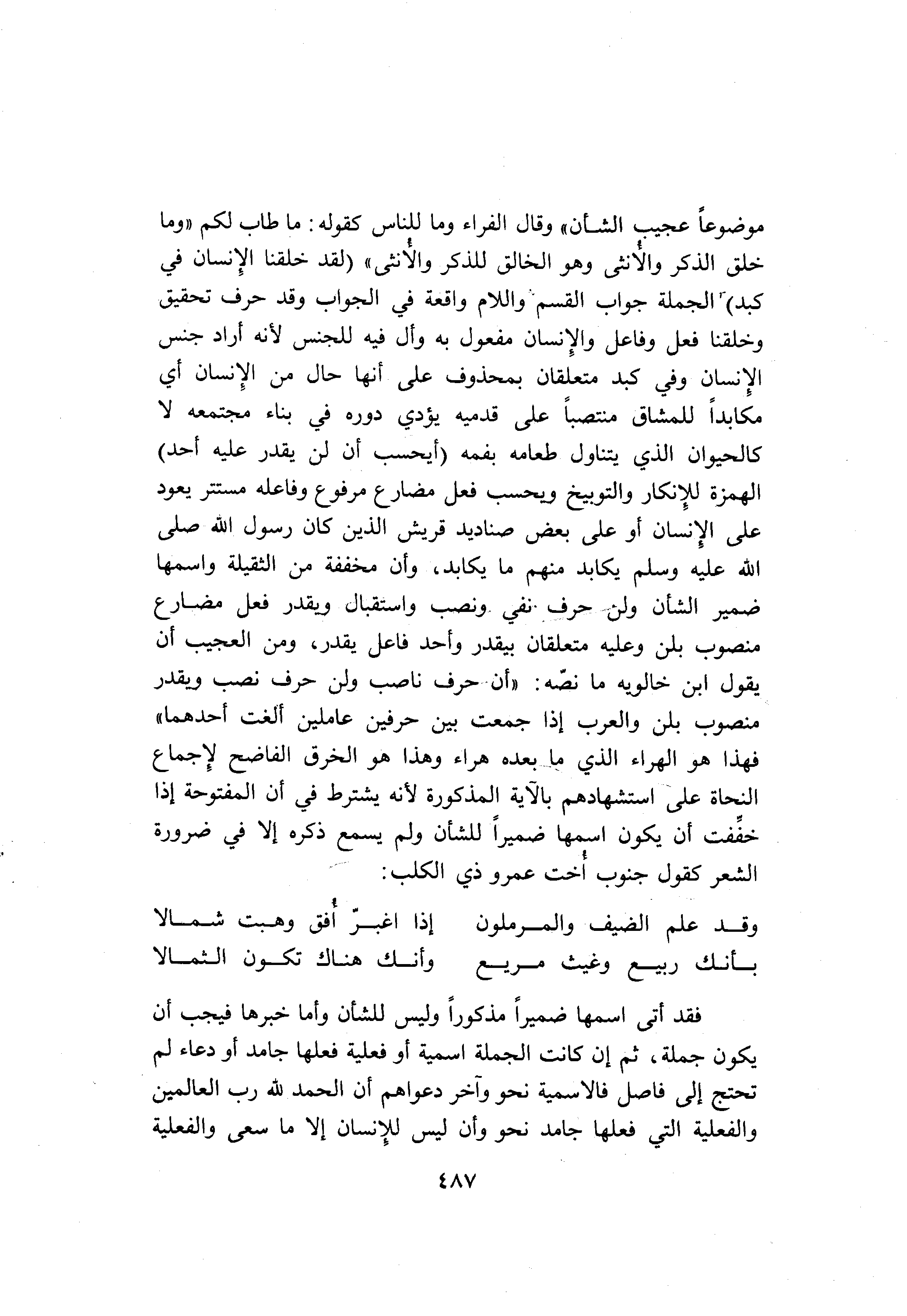 واللام واقعة في الجواب وقد حرف تحقيق وخلقنا فعل وفاعل والإنسان مفعول به وأل فيه للجنس لأنه أراد جنس الإنسان وفي كبد متعلقان بمحذوف على أنها حال من الإنسان أي مكابدا للمشاق منتصبا على قدميه يؤدي دوره في بناء مجتمعه لا كالحيوان الذي يتناول طعامه بفمه (أَيَحْسَبُ أَنْ لَنْ يَقْدِرَ عَلَيْهِ أَحَدٌ) الهمزة للإنكار والتوبيخ ويحسب فعل مضارع مرفوع وفاعله مستتر يعود على الإنسان أو على بعض صناديد قريش الذين كان رسول الله صلّى الله عليه وسلم يكابد منهم ما يكابد، وأن مخففة من الثقيلة واسمها ضمير الشأن ولن حرف نفي ونصب واستقبال ويقدر فعل مضارع منصوب بلن وعليه متعلقان بيقدر وأحد فاعل يقدر، ومن العجيب أن يقول ابن خالويه ما نصّه: «أن حرف ناصب ولن حرف نصب ويقدر منصوب بلن والعرب إذا جمعت بين حرفين عاملين ألغت أحدهما» فهذا هو الهراء الذي ما بعده هراء وهذا هو الخرق الفاضح لإجماع النحاة على استشهادهم بالآية المذكورة لأنه يشترط في أن المفتوحة إذا خفّفت أن يكون اسمها ضميرا للشأن ولم يسمع ذكره إلا في ضرورة الشعر كقول جنوب أخت عمرو ذي الكلب: