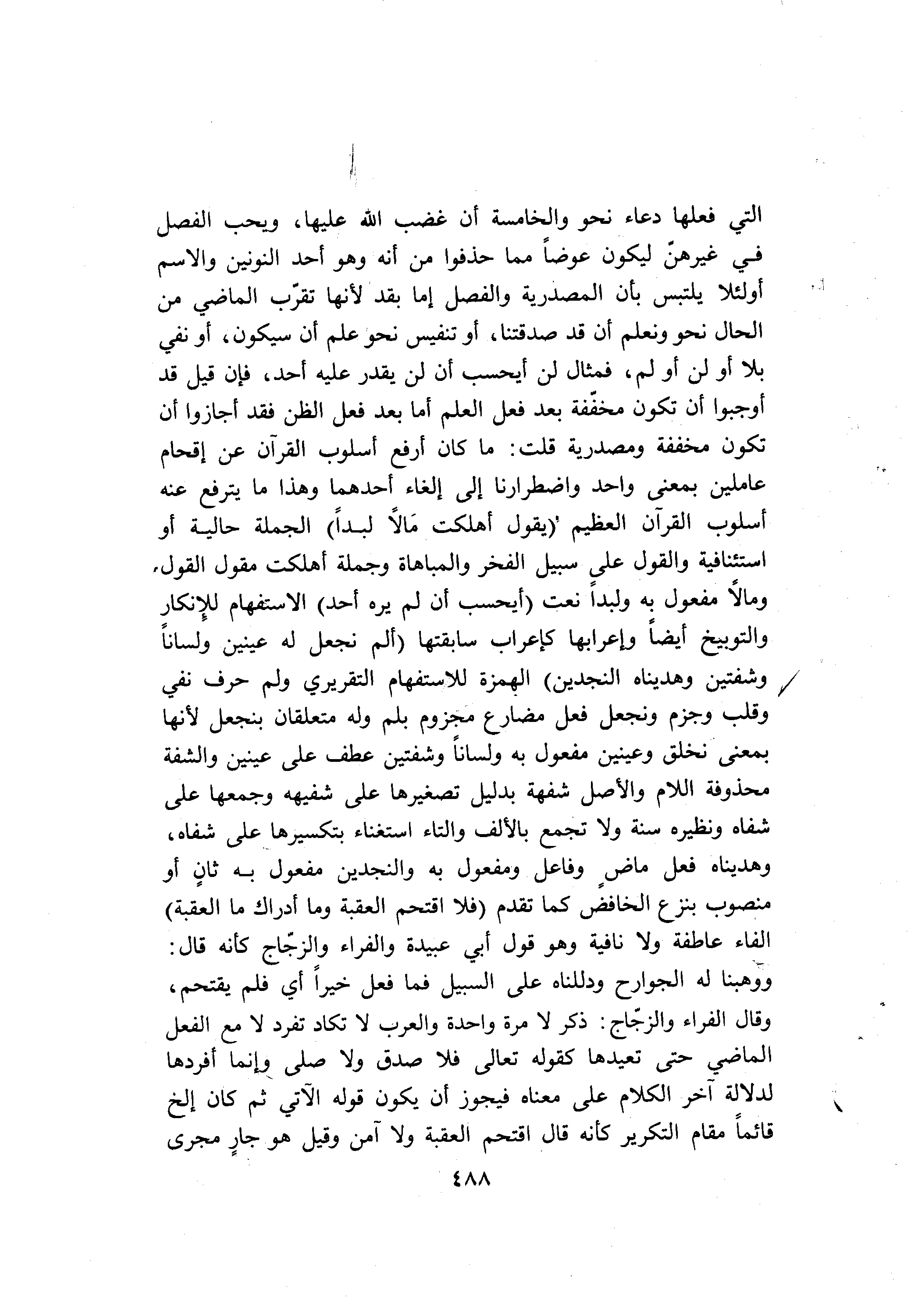 التي فعلها دعاء نحو والخامسة أن غضب الله عليها، ويحب الفصل في غيرهنّ ليكون عوضا مما حذفوا من أنه وهو أحد النونين والاسم أو لئلا يلتبس بأن المصدرية والفصل إما بقد لأنها تقرّب الماضي من الحال نحو ونعلم أن قد صدقتنا، أو تنفيس نحو علم أن سيكون، أو نفي بلا أو لن أو لم، فمثال لن أيحسب أن لن يقدر عليه أحد، فإن قيل قد أوجبوا أن تكون مخفّفة بعد فعل العلم أما بعد فعل الظن فقد أجازوا أن تكون مخففة ومصدرية قلت: ما كان أرفع أسلوب القرآن عن إقحام عاملين بمعنى واحد واضطرارنا إلى إلغاء أحدهما وهذا ما يترفع عنه أسلوب القرآن العظيم (يَقُولُ أَهْلَكْتُ مالًا لُبَداً) الجملة حالية أو استئنافية والقول على سبيل الفخر والمباهاة وجملة أهلكت مقول القول ومالا مفعول به ولبدا نعت (أَيَحْسَبُ أَنْ لَمْ يَرَهُ أَحَدٌ) الاستفهام للإنكار والتوبيخ أيضا وإعرابها كإعراب سابقتها (أَلَمْ نَجْعَلْ لَهُ عَيْنَيْنِ وَلِساناً وَشَفَتَيْنِ وَهَدَيْناهُ النَّجْدَيْنِ) الهمزة للاستفهام التقريري ولم حرف نفي وقلب وجزم ونجعل فعل مضارع مجزوم بلم وله متعلقان بنجعل لأنها بمعنى نخلق وعينين مفعول به ولسانا وشفتين عطف على عينين والشفة محذوفة اللام والأصل شفهة بدليل تصغيرها على شفيهه وجمعها على شفاه ونظيره سنة ولا تجمع بالألف والتاء استغناء بتكسيرها على شفاه، وهديناه فعل ماض وفاعل ومفعول به والنجدين مفعول به ثان أو منصوب بنزع الخافض كما تقدم (فَلَا اقْتَحَمَ الْعَقَبَةَ وَما أَدْراكَ مَا الْعَقَبَةُ) الفاء عاطفة ولا نافية وهو قول أبي عبيدة والفراء والزجّاج كأنه قال: