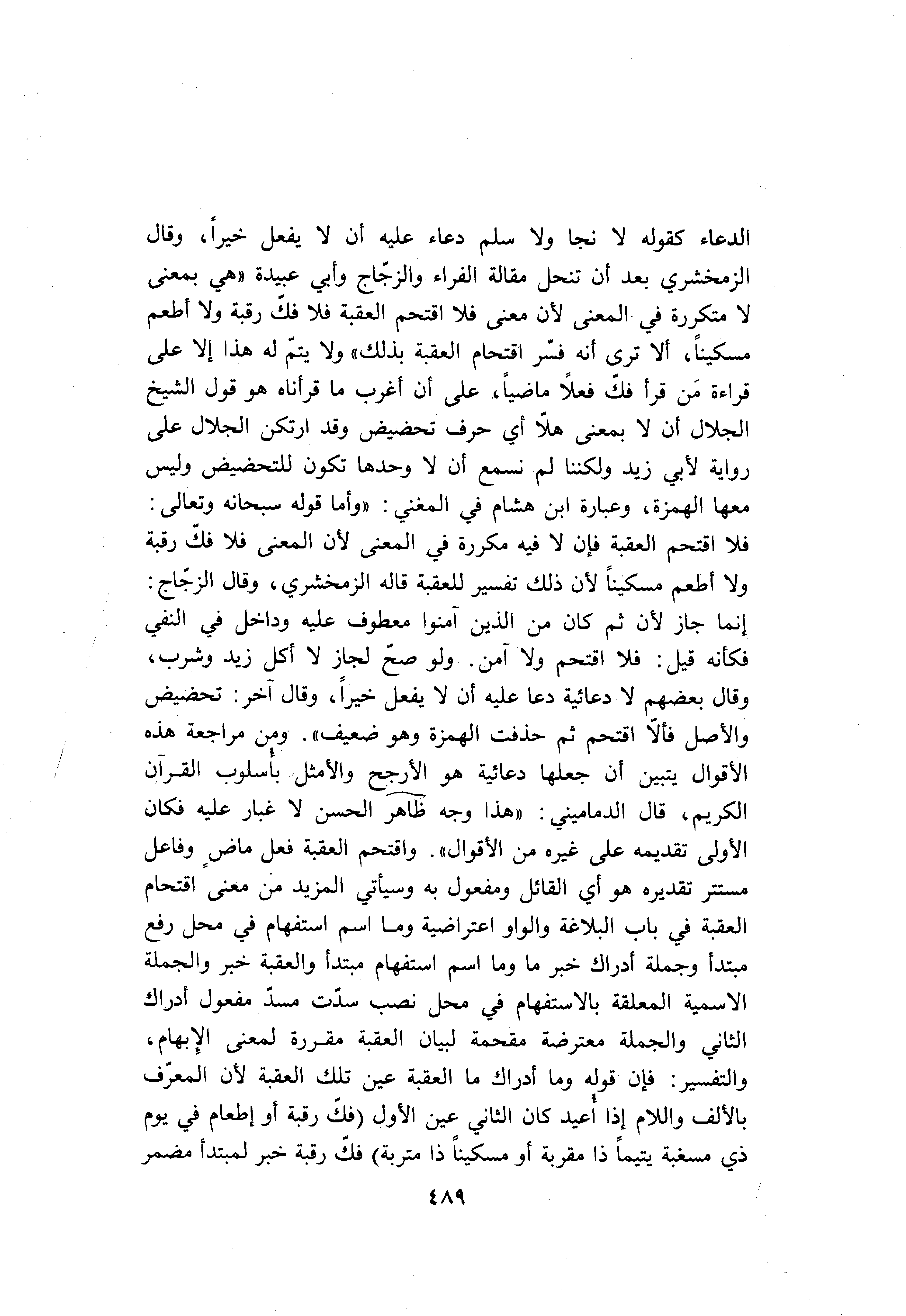 الدعاء كقوله لا نجا ولا سلم دعاء عليه أن لا يفعل خيرا، وقال الزمخشري بعد أن تنحل مقالة الفراء والزجّاج وأبي عبيدة «هي بمعنى لا متكررة في المعنى لأن معنى فلا اقتحم العقبة فلا فكّ رقبة ولا أطعم مسكينا، ألا ترى أنه فسّر اقتحام العقبة بذلك» ولا يتمّ له هذا إلا على قراءة من قرأ فكّ فعلا ماضيا، على أن أغرب ما قرأناه هو قول الشيخ الجلال أن لا بمعنى هلّا أي حرف تحضيض وقد ارتكن الجلال على رواية لأبي زيد ولكننا لم نسمع أن لا وحدها تكون للتحضيض وليس معها الهمزة، وعبارة ابن هشام في المغني: «وأما قوله سبحانه وتعالى: