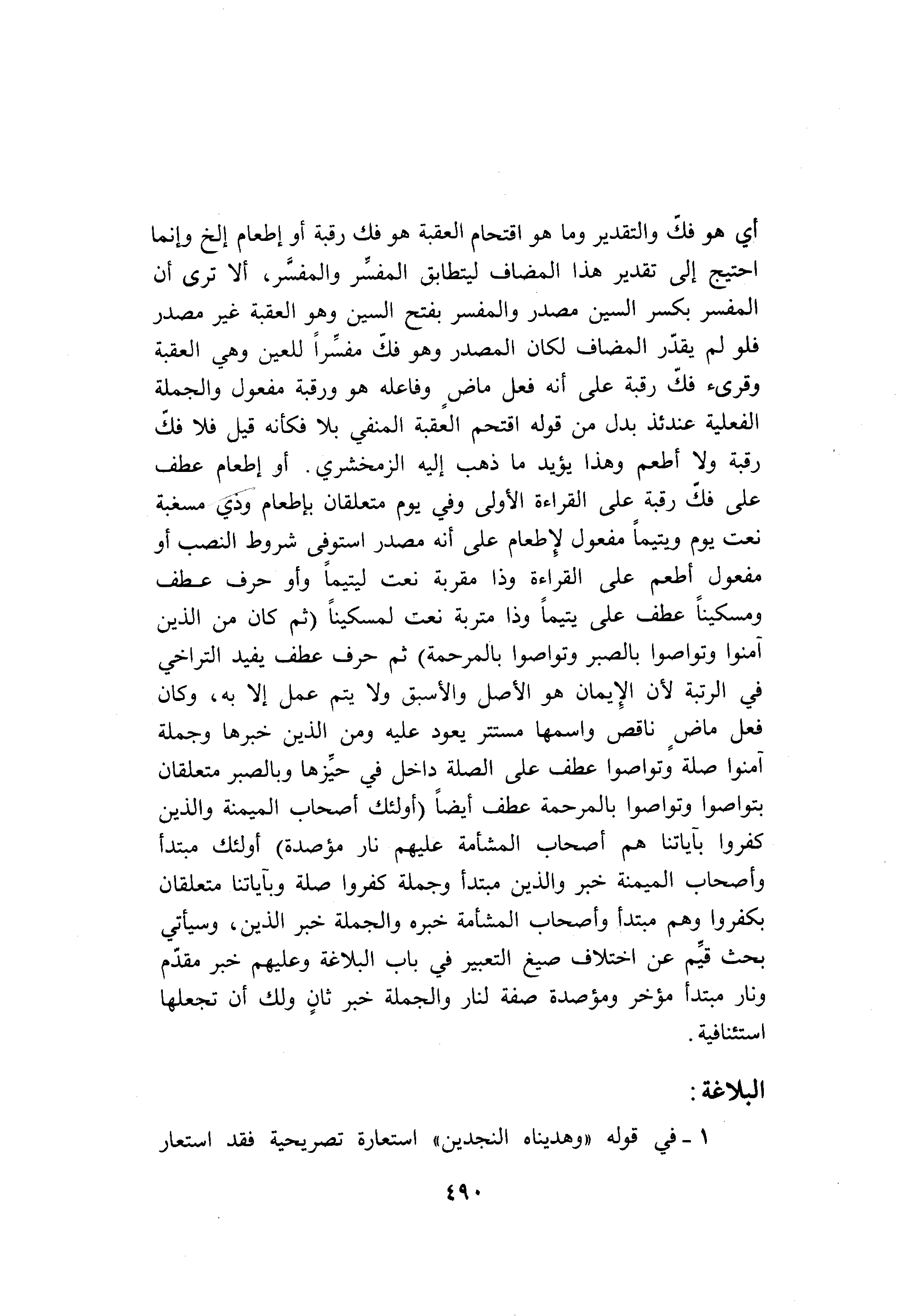 أي هو فكّ والتقدير وما هو اقتحام العقبة هو فك رقبة أو إطعام إلخ وإنما احتيج إلى تقدير هذا المضاف ليتطابق المفسّر والمفسّر، ألا ترى أن المفسر بكسر السين مصدر والمفسر بفتح السين وهو العقبة غير مصدر فلو لم يقدّر المضاف لكان المصدر وهو فكّ مفسّرا للعين وهي العقبة وقرىء فكّ رقبة على أنه فعل ماض وفاعله هو ورقبة مفعول والجملة الفعلية عندئذ بدل من قوله اقتحم العقبة المنفي بلا فكأنه قيل فلا فكّ رقبة ولا أطعم وهذا يؤيد ما ذهب إليه الزمخشري. أو إطعام عطف على فكّ رقبة على القراءة الأولى وفي يوم متعلقان بإطعام وذي مسغبة نعت يوم ويتيما مفعول لإطعام على أنه مصدر استوفى شروط النصب أو مفعول أطعم على القراءة وذا مقربة نعت ليتيما وأو حرف عطف ومسكينا عطف على يتيما وذا متربة نعت لمسكينا (ثُمَّ كانَ مِنَ الَّذِينَ آمَنُوا وَتَواصَوْا بِالصَّبْرِ وَتَواصَوْا بِالْمَرْحَمَةِ) ثم حرف عطف يفيد التراخي في الرتبة لأن الإيمان هو الأصل والأسبق ولا يتم عمل إلا به، وكان فعل ماض ناقص واسمها مستتر يعود عليه ومن الذين خبرها وجملة آمنوا صلة وتواصوا عطف على الصلة داخل في حيّزها وبالصبر متعلقان بتواصوا وتواصوا بالمرحمة عطف أيضا (أُولئِكَ أَصْحابُ الْمَيْمَنَةِ وَالَّذِينَ كَفَرُوا بِآياتِنا هُمْ أَصْحابُ الْمَشْأَمَةِ عَلَيْهِمْ نارٌ مُؤْصَدَةٌ) أولئك مبتدأ وأصحاب الميمنة خبر والذين مبتدأ وجملة كفروا صلة وبآياتنا متعلقان بكفروا وهم مبتدأ وأصحاب المشأمة خبره والجملة خبر الذين، وسيأتي بحث قيّم عن اختلاف صيغ التعبير في باب البلاغة وعليهم خبر مقدّم ونار مبتدأ مؤخر ومؤصدة صفة لنار والجملة خبر ثان ولك أن تجعلها استئنافية.