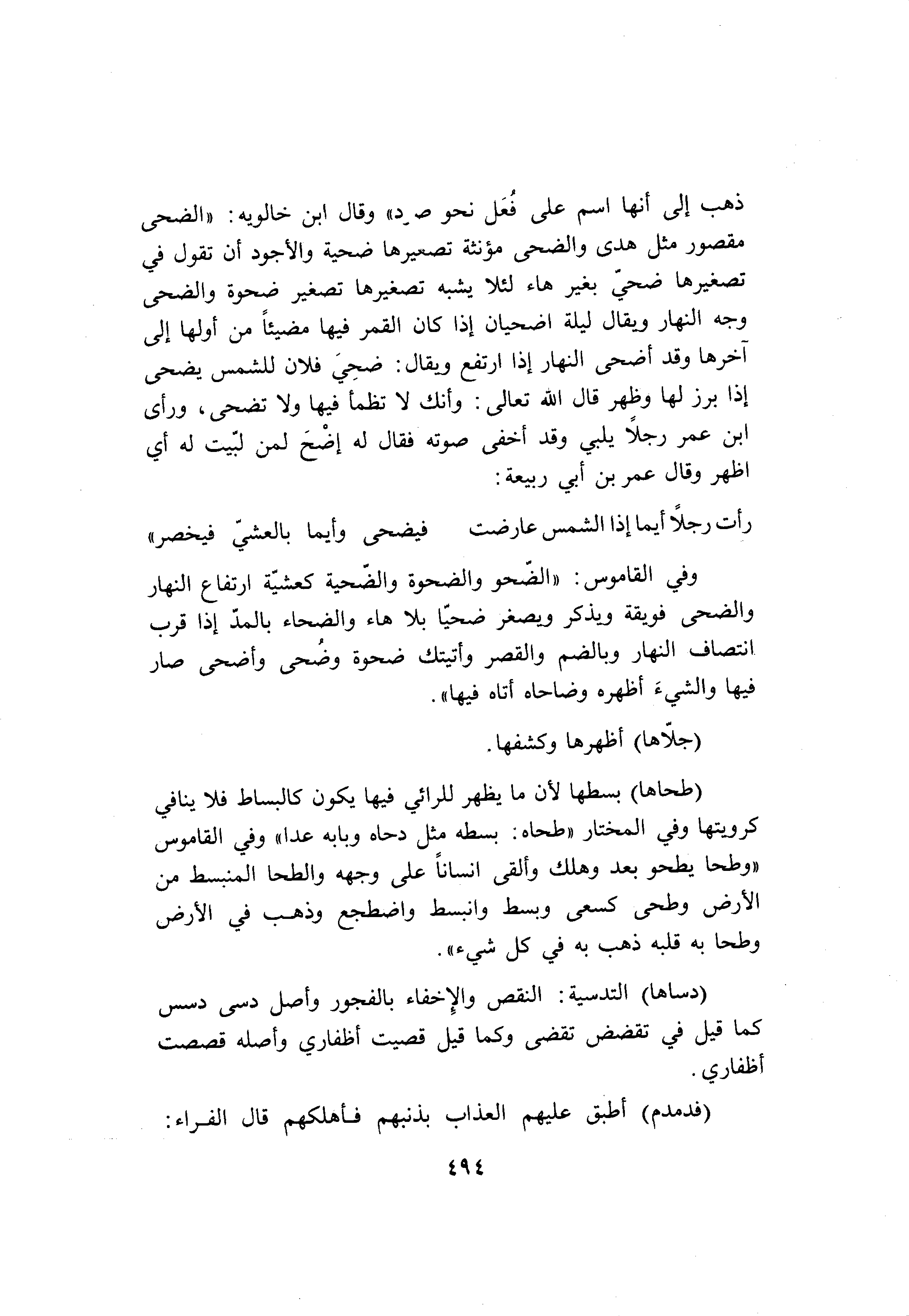 ذهب إلى أنها اسم على فعل نحو صرد» وقال ابن خالويه: «الضحى مقصور مثل هدى والضحى مؤنثة تصغيرها ضحية والأجود أن تقول في تصغيرها ضحيّ بغير هاء لئلا يشبه تصغيرها تصغير ضحوة والضحى وجه النهار ويقال ليلة اضحيان إذا كان القمر فيها مضيئا من أولها إلى آخرها وقد أضحى النهار إذا ارتفع ويقال: ضحي فلان للشمس يضحى إذا برز لها وظهر قال الله تعالى: وأنك لا تظمأ فيها ولا تضحى، ورأى ابن عمر رجلا يلبي وقد أخفى صوته فقال له أضح لمن لبّيت له أي اظهر وقال عمر بن أبي ربيعة: