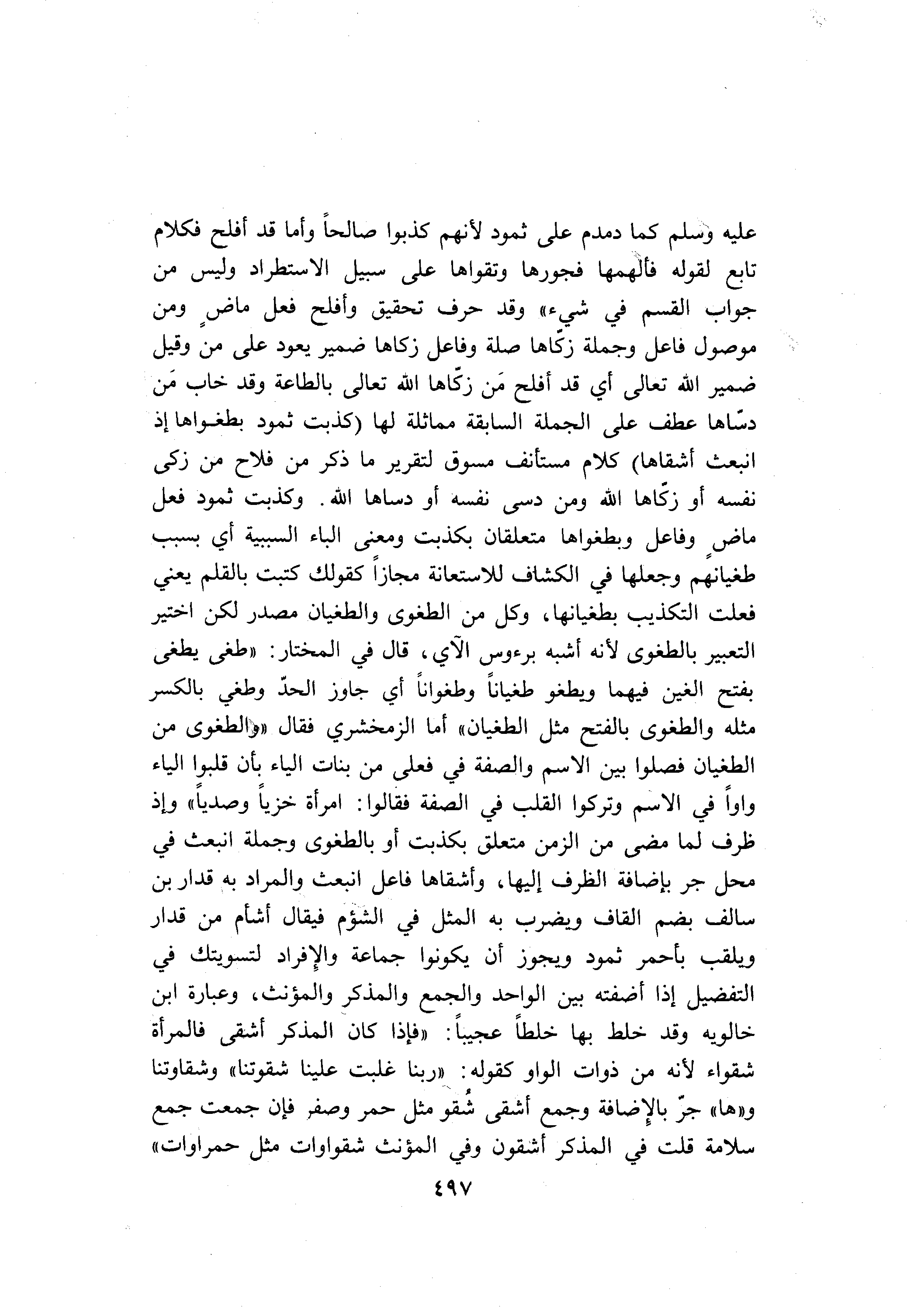 عليه وسلم كما دمدم على ثمود لأنهم كذبوا صالحا وأما قد أفلح فكلام تابع لقوله فألهمها فجورها وتقواها على سبيل الاستطراد وليس من جواب القسم في شيء» وقد حرف تحقيق وأفلح فعل ماض ومن موصول فاعل وجملة زكّاها صلة وفاعل زكاها ضمير يعود على من وقيل ضمير الله تعالى أي قد أفلح من زكّاها الله تعالى بالطاعة وقد خاب من دسّاها عطف على الجملة السابقة مماثلة لها (كَذَّبَتْ ثَمُودُ بِطَغْواها إِذِ انْبَعَثَ أَشْقاها) كلام مستأنف مسوق لتقرير ما ذكر من فلاح من زكى نفسه أو زكّاها الله ومن دسى نفسه أو دساها الله. وكذبت ثمود فعل ماض وفاعل وبطغواها متعلقان بكذبت ومعنى الباء السببية أي بسبب طغيانهم وجعلها في الكشاف للاستعانة مجازا كقولك كتبت بالقلم يعني فعلت التكذيب بطغيانها، وكل من الطغوى والطغيان مصدر لكن اختير التعبير بالطغوى لأنه أشبه برءوس الآي، قال في المختار: «طغى يطغى بفتح الغين فيهما ويطغو طغيانا وطغوانا أي جاوز الحدّ وطغي بالكسر مثله والطغوى بالفتح مثل الطغيان» أما الزمخشري فقال «والطغوى من الطغيان فصلوا بين الاسم والصفة في فعلى من بنات الياء بأن قلبوا الياء واوا في الاسم وتركوا القلب في الصفة فقالوا: امرأة خزيا وصديا» وإذا ظرف لما مضى من الزمن متعلق بكذبت أو بالطغوى وجملة انبعث في محل جر بإضافة الظرف إليها، وأشقاها فاعل انبعث والمراد به قدار بن سالف بضم القاف ويضرب به المثل في الشؤم فيقال أشأم من قدار ويلقب بأحمر ثمود ويجوز أن يكونوا جماعة والإفراد لتسويتك في التفضيل إذا أضفته بين الواحد والجمع والمذكر والمؤنث، وعبارة ابن خالويه وقد خلط بها خلطا عجيبا: «فإذا كان المذكر أشقى فالمرأة شقواء لأنه من ذوات الواو كقوله: «ربنا غلبت علينا شقوتنا» وشقاوتنا و «ها» جرّ بالإضافة وجمع أشقى شقو مثل حمر وصفر فإن جمعت جمع سلامة قلت في المذكر أشقون وفي المؤنث شقواوات مثل حمراوات»