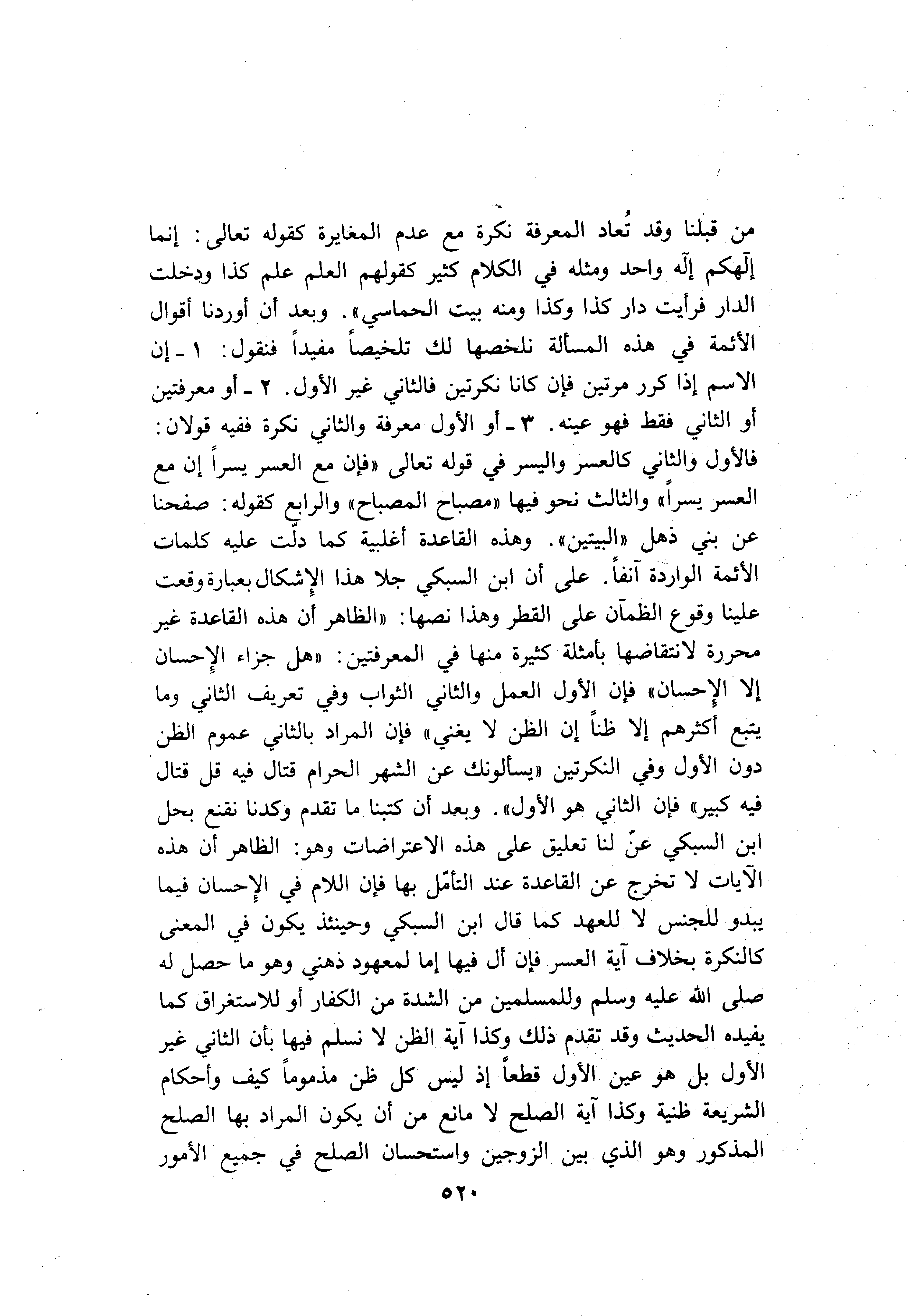 فالأول والثاني كالعسر واليسر في قوله تعالى «فإن مع العسر يسرا إن مع العسر يسرا» والثالث نحو فيها «مصباح المصباح» والرابع كقوله: صفحنا عن بني ذهل «البيتين» . وهذه القاعدة أغلبية كما دلّت عليه كلمات الأئمة الواردة آنفا. على أن ابن السبكي جلا هذا الإشكال بعبارة وقعت علينا وقوع الظمآن على القطر وهذا نصها: «الظاهر أن هذه القاعدة غير محررة لانتقاضها بأمثلة كثيرة منها في المعرفتين: «هل جزاء الإحسان إلا الإحسان» فإن الأول العمل والثاني الثواب وفي تعريف الثاني وما يتبع أكثرهم إلا ظنا إن الظن لا يغني» فإن المراد بالثاني عموم الظن دون الأول وفي النكرتين «يسألونك عن الشهر الحرام قتال فيه قل قتال فيه كبير» فإن الثاني هو الأول» . وبعد أن كتبنا ما تقدم وكدنا نقنع بحل ابن السبكي عنّ لنا تعليق على هذه الاعتراضات وهو: الظاهر أن هذه الآيات لا تخرج عن القاعدة عند التأمّل بها فإن اللام في الإحسان فيما يبدو للجنس لا للعهد كما قال ابن السبكي وحينئذ يكون في المعنى كالنكرة بخلاف آية العسر فإن أل فيها إما لمعهود ذهني وهو ما حصل له صلّى الله عليه وسلم وللمسلمين من الشدة من الكفار أو للاستغراق كما يفيده الحديث وقد تقدم ذلك وكذا آية الظن لا نسلم فيها بأن الثاني غير الأول بل هو عين الأول قطعا إذ ليس كل ظن مذموما كيف وأحكام الشريعة ظنية وكذا آية الصلح لا مانع من أن يكون المراد بها الصلح المذكور وهو الذي بين الزوجين واستحسان الصلح في جميع الأمور