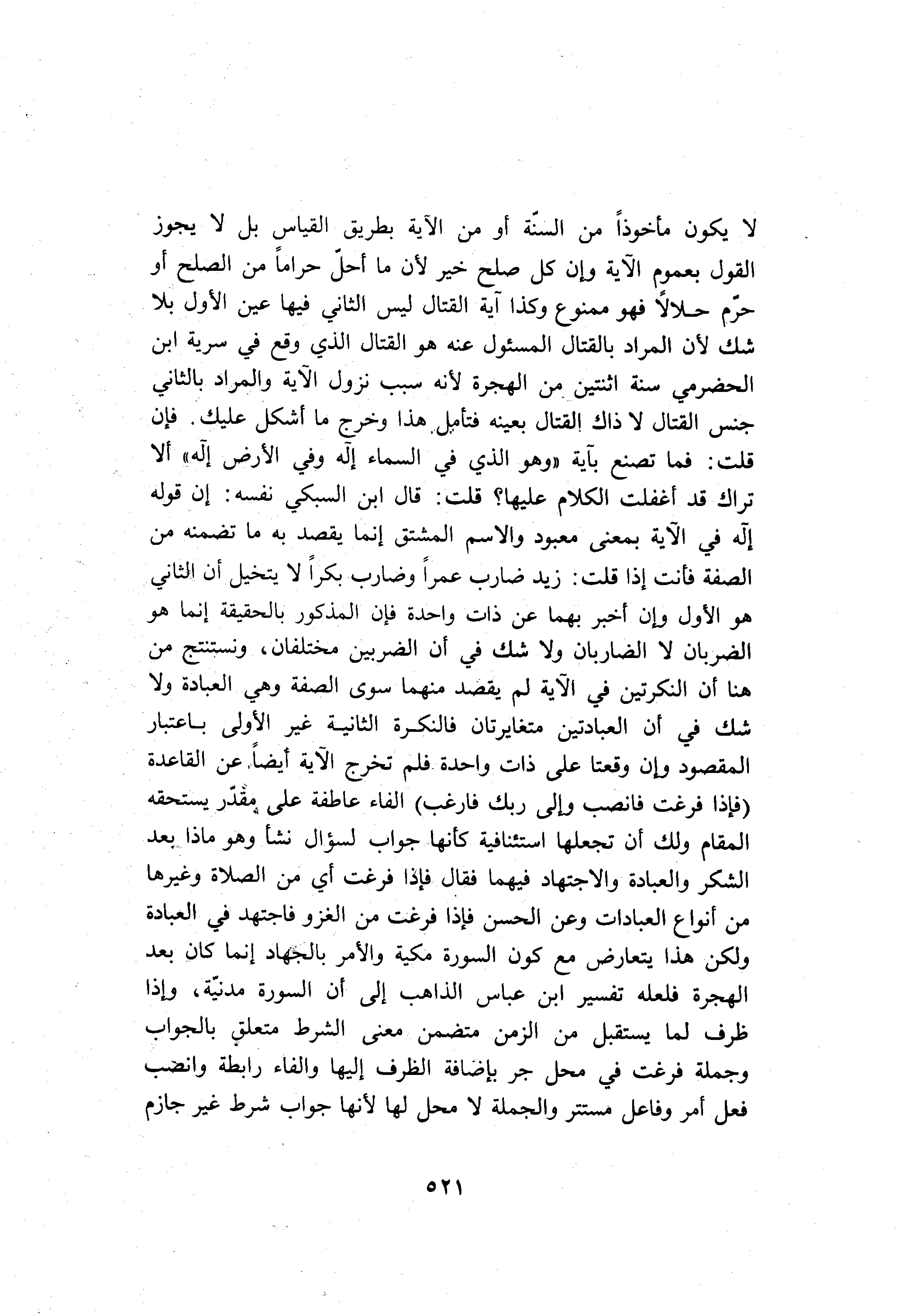 لا يكون مأخوذا من السنّة أو من الآية بطريق القياس بل لا يجوز القول بعموم الآية وإن كل صلح خير لأن ما أحلّ حراما من الصلح أو حرّم حلالا فهو ممنوع وكذا آية القتال ليس الثاني فيها عين الأول بلا شك لأن المراد بالقتال المسئول عنه هو القتال الذي وقع في سرية ابن الحضرمي سنة اثنتين من الهجرة لأنه سبب نزول الآية والمراد بالثاني جنس القتال لا ذاك القتال بعينه فتأمل هذا وخرج ما أشكل عليك. فإن قلت: فما تصنع بآية «وهو الذي في السماء إله وفي الأرض إله» ألا تراك قد أغفلت الكلام عليها؟ قلت: قال ابن السبكي نفسه: إن قوله إله في الآية بمعنى معبود والاسم المشتق إنما يقصد به ما تضمنه من الصفة فأنت إذا قلت: زيد ضارب عمرا وضارب بكرا لا يتخيل أن الثاني هو الأول وإن أخبر بهما عن ذات واحدة فإن المذكور بالحقيقة إنما هو الضربان لا الضاربان ولا شك في أن الضربين مختلفان، ونستنتج من هنا أن النكرتين في الآية لم يقصد منهما سوى الصفة وهي العبادة ولا شك في أن العبادتين متغايرتان فالنكرة الثانية غير الأولى باعتبار المقصود وإن وقعتا على ذات واحدة فلم تخرج الآية أيضا عن القاعدة (فَإِذا فَرَغْتَ فَانْصَبْ وَإِلى رَبِّكَ فَارْغَبْ) الفاء عاطفة على مقدّر يستحقه المقام ولك أن تجعلها استئنافية كأنها جواب لسؤال نشأ وهو ماذا بعد الشكر والعبادة والاجتهاد فيهما فقال فإذا فرغت أي من الصلاة وغيرها من أنواع العبادات وعن الحسن فإذا فرغت من الغزو فاجتهد في العبادة ولكن هذا يتعارض مع كون السورة مكية والأمر بالجهاد إنما كان بعد الهجرة فلعله تفسير ابن عباس الذاهب إلى أن السورة مدنيّة، وإذا ظرف لما يستقبل من الزمن متضمن معنى الشرط متعلق بالجواب وجملة فرغت في محل جر بإضافة الظرف إليها والفاء رابطة وانصب فعل أمر وفاعل مستتر والجملة لا محل لها لأنها جواب شرط غير جازم