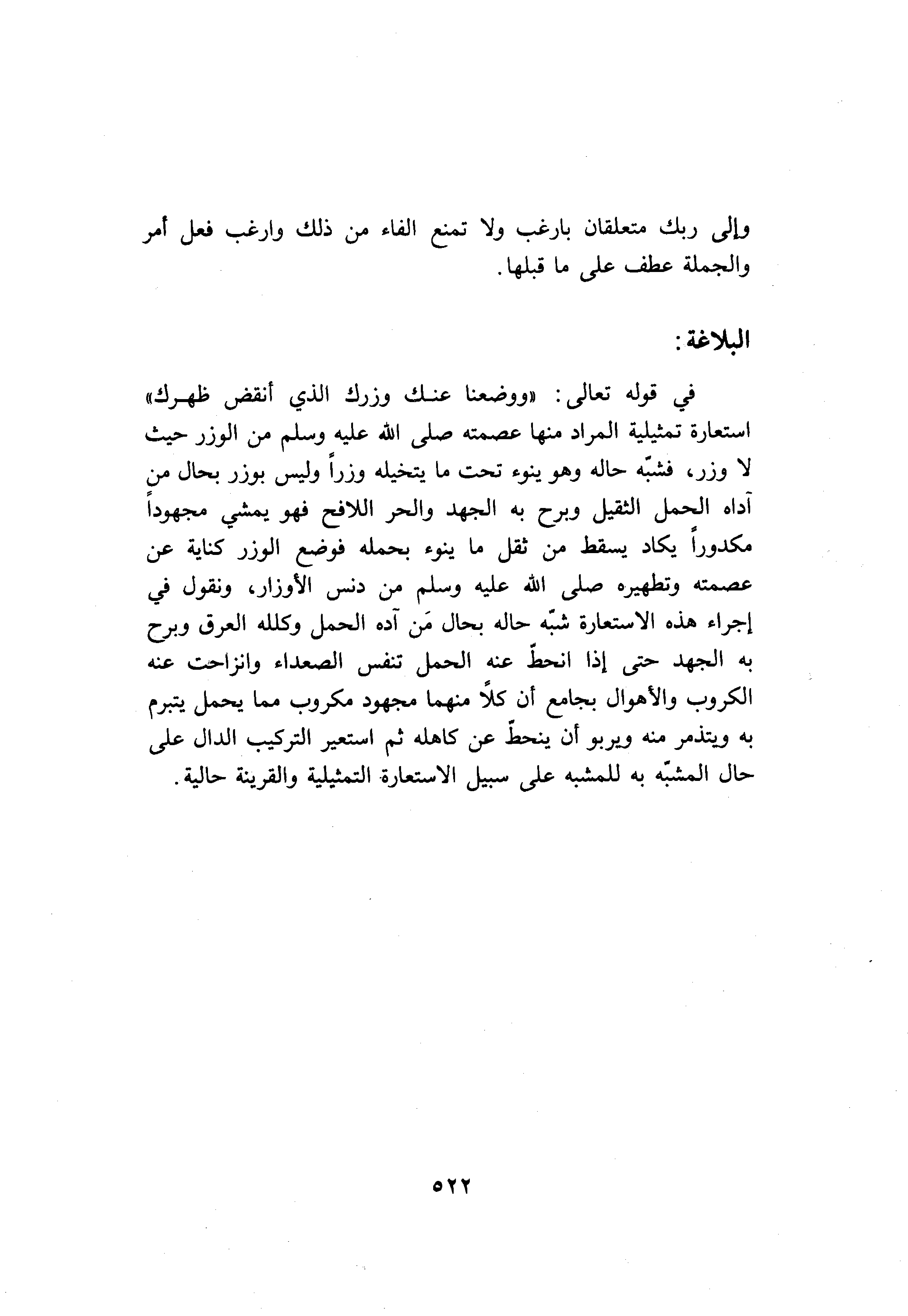 في قوله تعالى: «ووضعنا عنك وزرك الذي أنقض ظهرك» استعارة تمثيلية المراد منها عصمته صلّى الله عليه وسلم من الوزر حيث لا وزر، فشبّه حاله وهو ينوء تحت ما يتخيله وزرا وليس بوزر بحال من آداه الحمل الثقيل وبرح به الجهد والحر اللافح فهو يمشي مجهودا مكدورا يكاد يسقط من ثقل ما ينوء بحمله فوضع الوزر كناية عن عصمته وتطهيره صلّى الله عليه وسلم من دنس الأوزار، ونقول في إجراء هذه الاستعارة شبّه حاله بحال من آده الحمل وكلله العرق وبرح به الجهد حتى إذا انحطّ عنه الحمل تنفس الصعداء وانزاحت عنه الكروب والأهوال بجامع أن كلا منهما مجهود مكروب مما يحمل يتبرم به ويتذمر منه ويربو أن ينحطّ عن كاهله ثم استعير التركيب الدال على حال المشبّه به للمشبه على سبيل الاستعارة التمثيلية والقرينة حالية.