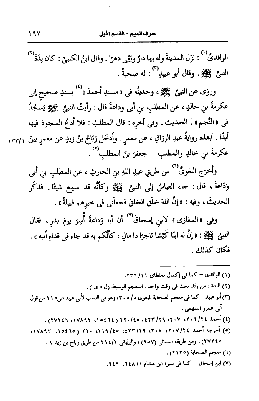 وروى عَنِ النَّبِيِّ صَلى الله عَلَيه وسَلم وحديثه في مسند أَحمد بسند صحيح إلى عكرمة بن خالد، عَن المطلب بن أبي وداعة، قال: رَأيتُ النَّبيّ صَلى الله عَلَيه وسَلم يسجد في النجم الحديث وفي آخره قال المطلب فلا أدع السجود فيها أبدا.