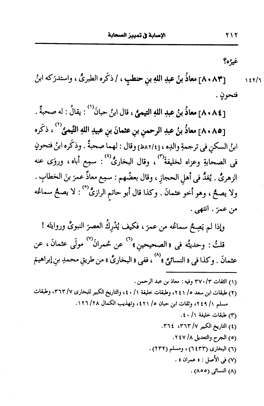 قلت: وحديثه في الصحيحين، عَن حمران مولى عثمان، عَن عثمان وكذا في النسائي ففي البُخارِيّ من طريق محمد بن إبراهيم التيمي وعند مسلم والنسائي من طريق نافع بن جبير وغيرهم كلهم، عَن معاذ بن عبد الرحمن، عَن حمران.