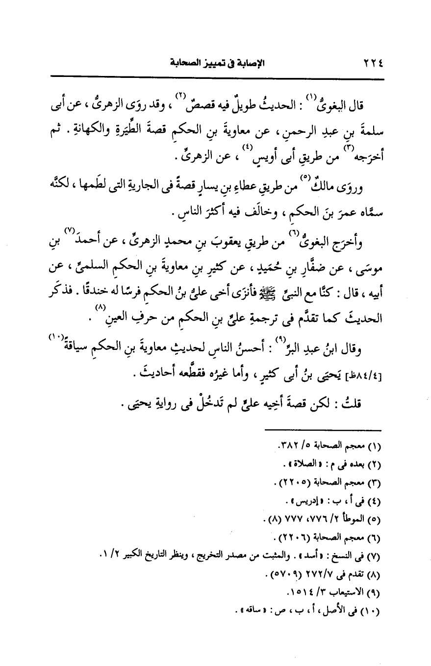 وقال ابن عَبْد البر: أحسن الناس لحديث معاوية بن الحكم سياقه يحيى بن أبي كثير وأما غيره فقطعه أحاديث.