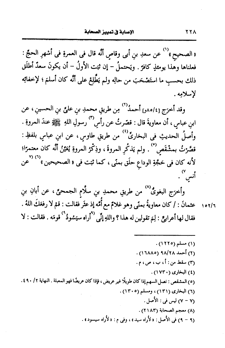 وقد أخرج أَحمد من طريق محمد بن علي بن الحسين، عَن ابن عباس أن معاوية قال قصرت، عَن رسول الله صَلى الله عَلَيه وسَلم عند المروة وأصل الحديث في البُخارِيّ من طريق طاوُوس، عَن ابن عباس بلفظ قصرت بمشقص ولم يذكر المروة وذكر المروة يعين أنه كان معتمرا لأنه كان في حجة الوداع حلق بمنى كما ثبت في الصحيحين، عَن أنس.