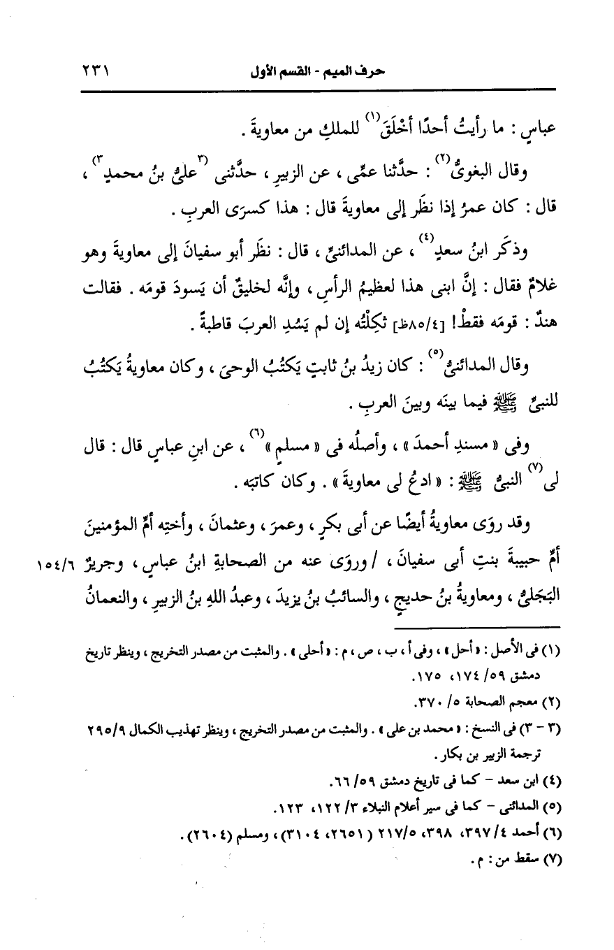 وقال البَغَوِيُّ: حَدَّثنا عمي، عَن الزبير حدثني محمد بن علي، قال: كان عمر إذا نظر إلى معاوية قال هذا كسرى العرب.
