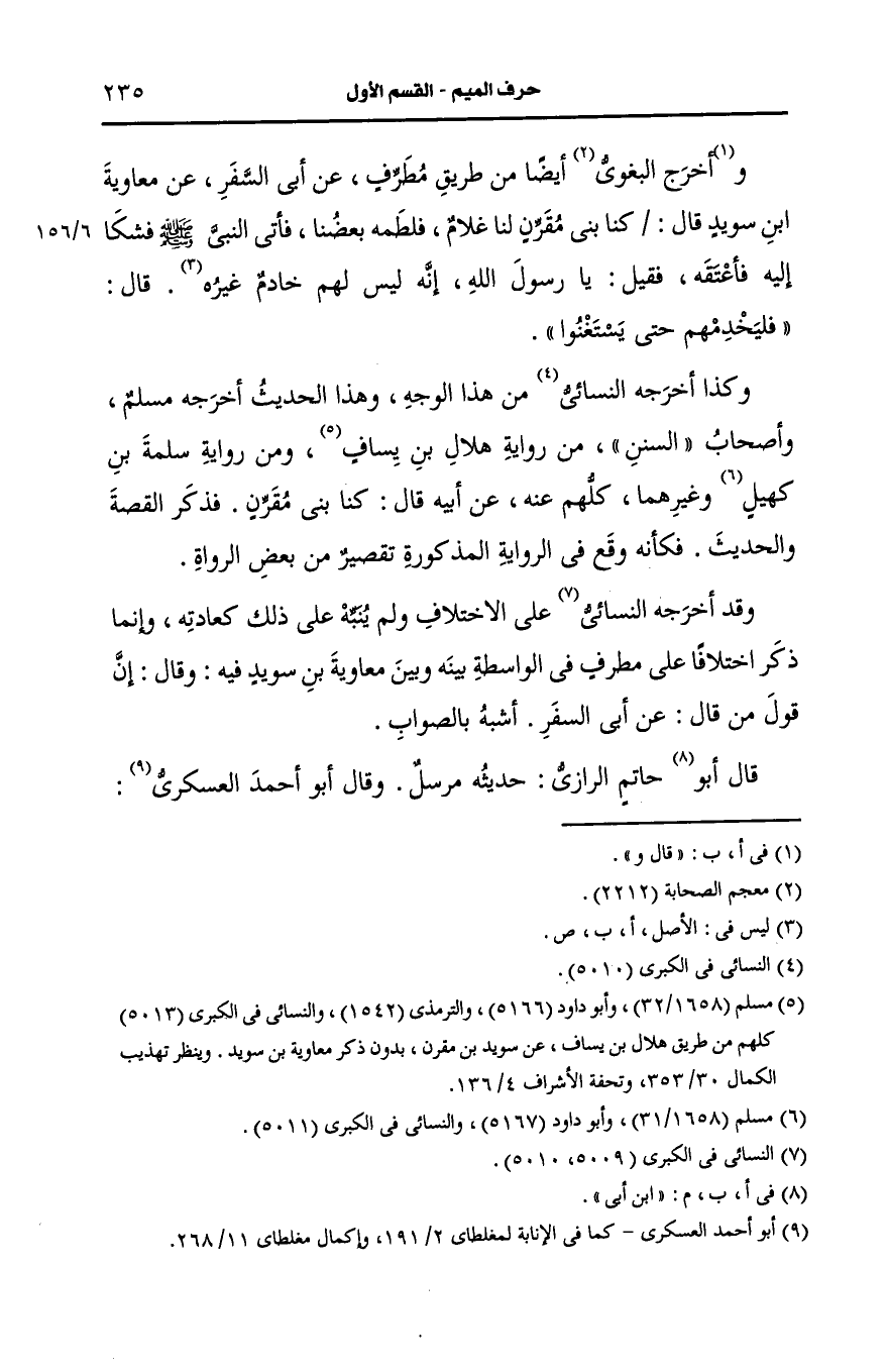 وأخرج البغوي أيضًا من طريق مطرف، عَن أبي السفر، عَن معاوية بن سويد قال كنا بني مقرن لنا غلام فلطمه بعضنا فأتى النَّبيّ صَلى الله عَلَيه وسَلم فشكا إليه فأعتقه فقيل يا رسول الله أنه ليس لهم خادم غيره فقال فليخدمهم حتى يستغنوا.