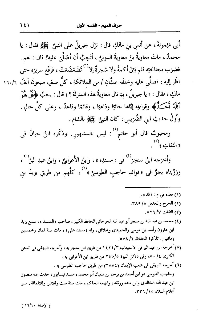 وأَخرجه ابن سنجر في مسنده، وابن الأعرابي، وابن عَبد البَرِّ ورويناه بعلو في فوائد حاجب الطوسي كلهم من طريق يزيد بن هارون أنبأنا العلامة أَبو محمد الثَّقفي سمعت أنس بن مالك يقول غزونا مع رسول الله صَلى الله عَلَيه وسَلم غزوة تبوك فطلعت الشمس يوما بنور وشعاع وضياء لم نره قبل ذلك فتعجب النَّبيّ صَلى الله عَلَيه وسَلم من شأنها إذ أتاه جبريل فقال مات معاوية بن معاوية الليثي فبعث الله سبعين ألف ملك يصلون عليه قال بم ذاك قال بكثرة تلاوته قل هو الله أحد فَذَكَرَ نَحْوَهُ وفيه فهل لك أن تصلي عليه فأقبض لك الأرض قال نعم فصلى عليه.