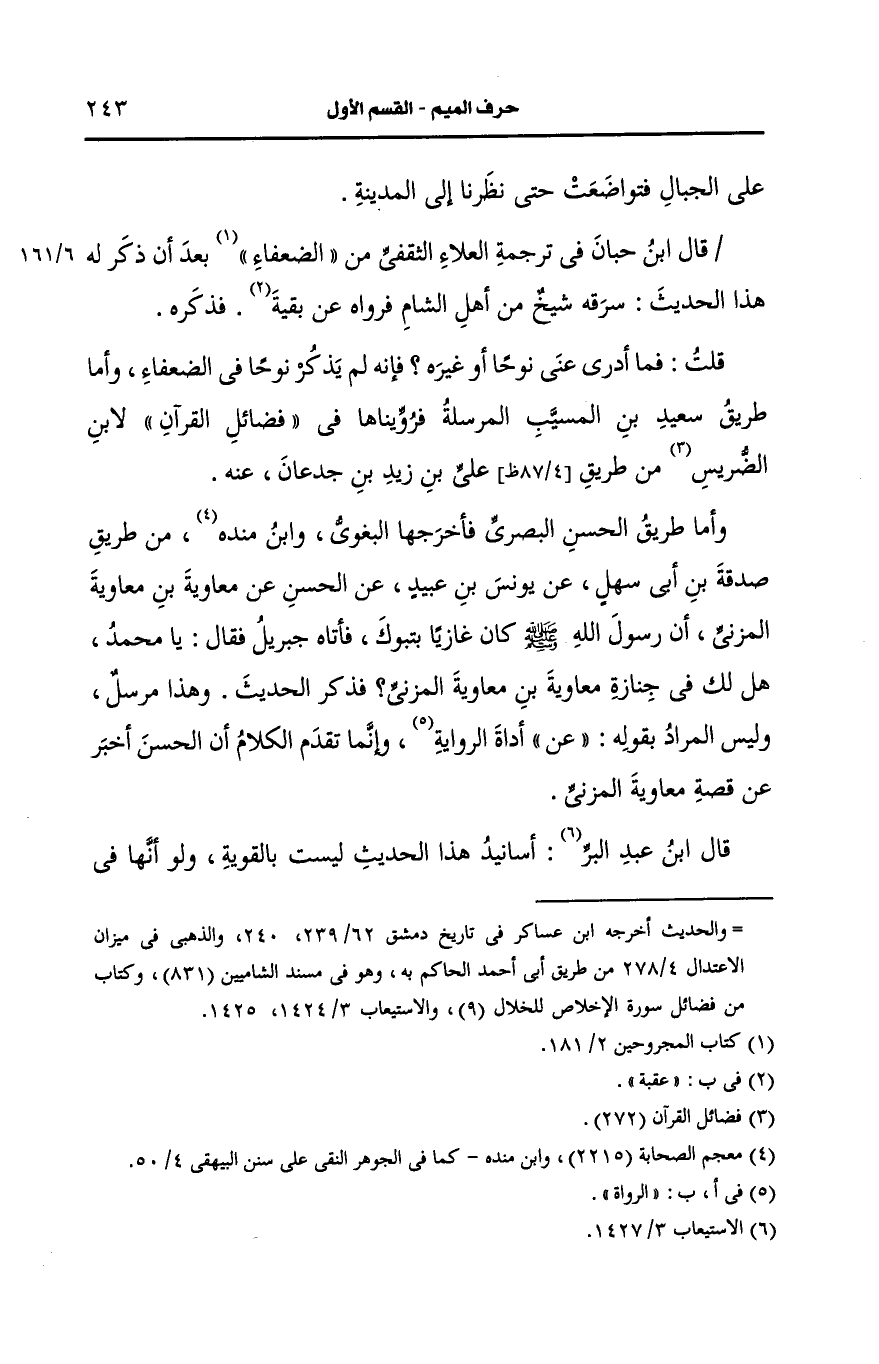 وأما طريق سعيد بن المسيب المرسلة فرويناها في فضائل القرآن لابن الضريس من طريق على بن زيد بن جدعان عنه وأما طريق الحسن البصري فأَخرجها البغوي، وابن مَنْدَه من طريق صدقة بن أبي سهل، عَن يونس بن عبيد، عَن الحسن، عَن معاوية بن معاوية المزني أن رسول الله صَلى الله عَلَيه وسَلم كان غازيا بتبوك فأتاه جبريل فقال يا محمد هل لك في جنازة معاوية بن معاوية المزني فذكر الحديث وهذا مرسل وليس المراد بقوله، عَن أداة الرواية وإنما تقدم الكلام أن الحسن أخبر، عَن قصة معاوية المزني.