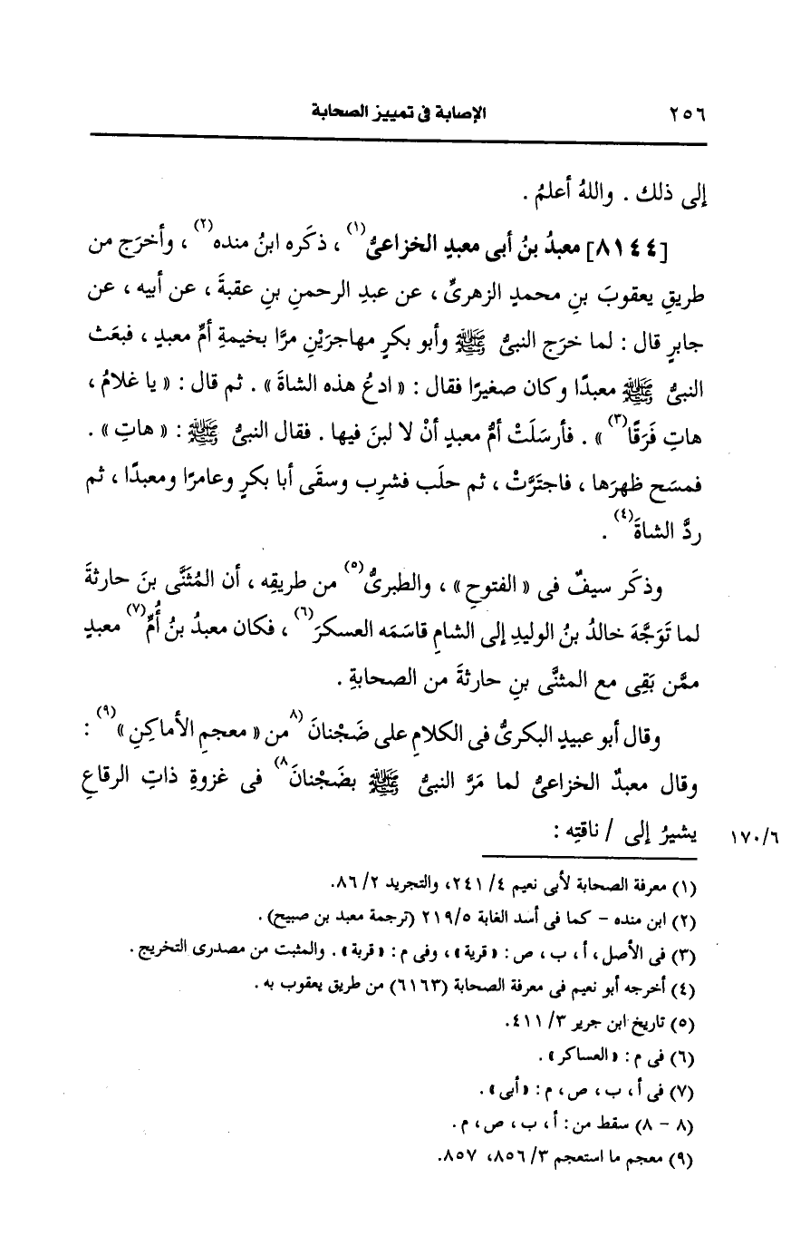 ذَكَرَهُ ابن مَنْدَه وأخرج من طريق يعقوب بن محمد الزُّهْرِيّ، عَن عبد الرحمن بن عقبة، عَن أَبيه، عَن جابر قال لما خرج النَّبيّ صَلى الله عَلَيه وسَلم، وأَبو بكر مهاجرين مرا بخيمة أم معبد فبعث النَّبيّ صَلى الله عَلَيه وسَلم معبدا، وكان صغيرا فقال "ادع هذه الشاة" ثم قال: يا غلام هات" قربة فأرسلت أم معبدا أن لا لبن فيها فقال النَّبيّ صَلى الله عَلَيه وسَلم "هات" فمسح ظهرها فاجترت ثم حلب فشرب وسقى أبا بكر وعامرا ومعبدا ثم رد الشاة.