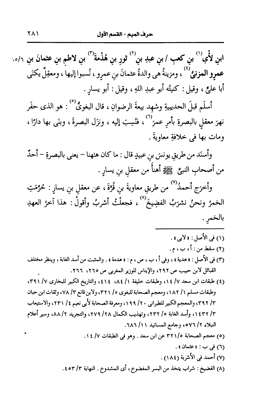 وأخرج أَحمد من طريق معاوية بن قرة، عَن معقل بن يسار حرمت الخمر ونحن نشرب الفصيح فجعلت أشرب وأقول هذا آخر العهد بالخمر.
