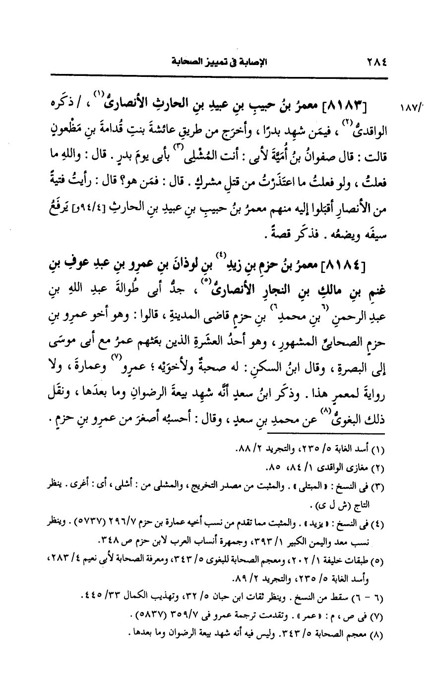 8184- معمر بن حزم بن يزيد بن لوذان بن عَمرو بن عبد عوف بن غنم بن مالك بن النجار، الأَنصارِيّ.