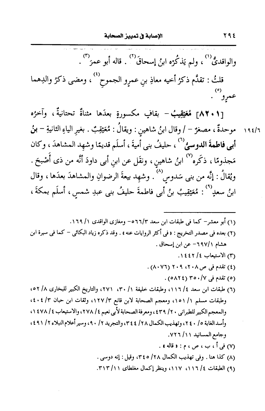 وقال ابن سعد معيقيب بن أبي فاطمة حليف بني عبد شمس أسلم بمكة، ويُقال: كان من مهاجرة الحبشة، وكان على بيت المال لعمر بن الخطاب ثم كان على خاتم عثمان بن عفان ومات في خلافته وقيل عاش إلى بعد الأربعين.