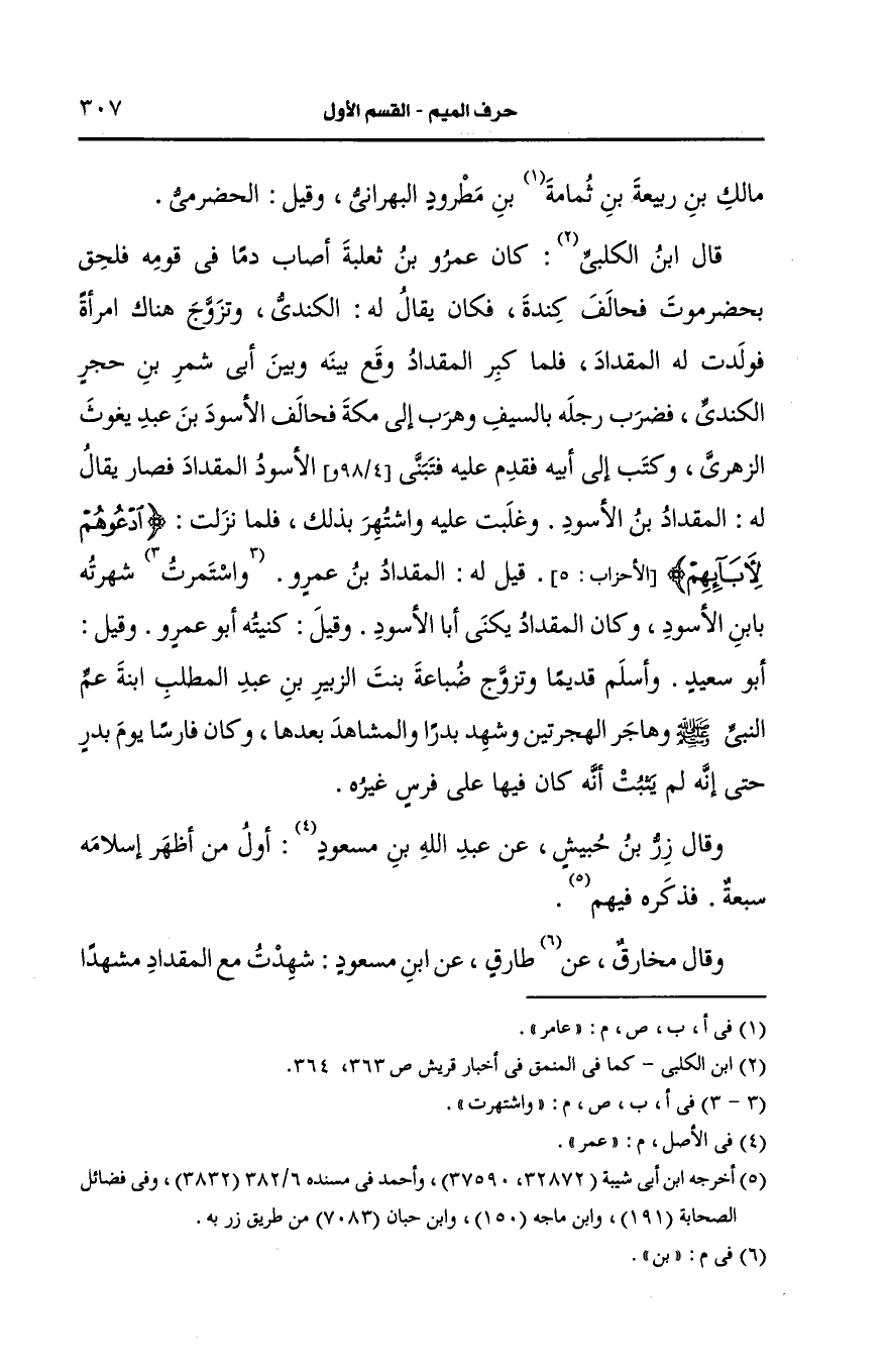 وذكر البغوي من طريق أبي بكر بن عياش، عَن عاصم، عَن زر أول من قاتل على فرس في سبيل الله المقداد بن الأَسود.