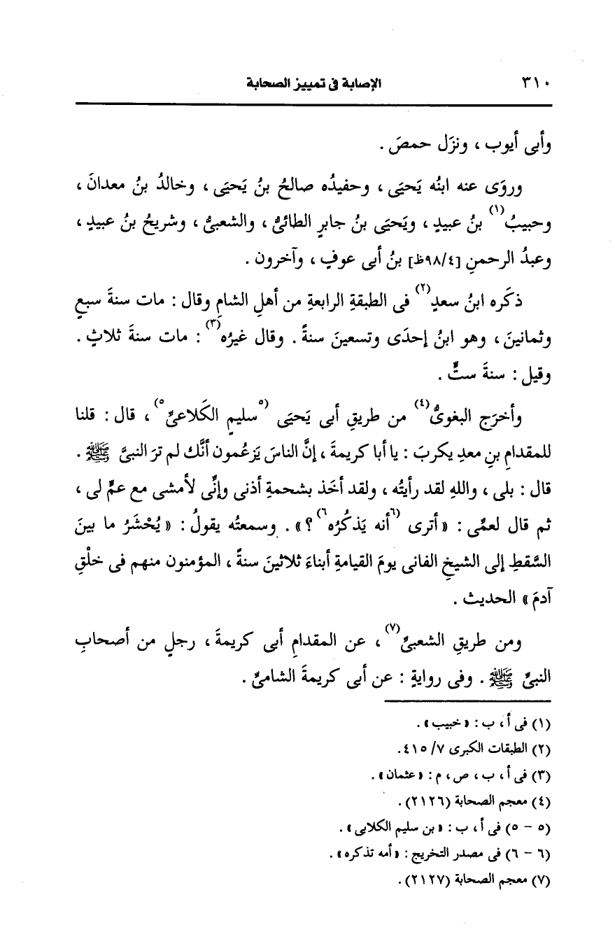 وأخرج البغوي من طريق أبي يحيى سليم الكلاعي قال قلنا للمقدام بن مَعدِي كَرِب يا أبا كريمة إن الناس يزعمون أنك لم تر النَّبيّ صَلى الله عَلَيه وسَلم قال بلى والله لقد رأيته ولقد أخذ بشحمة أذني وإني لأمشي مع عم لي ثم قال لعمي:
