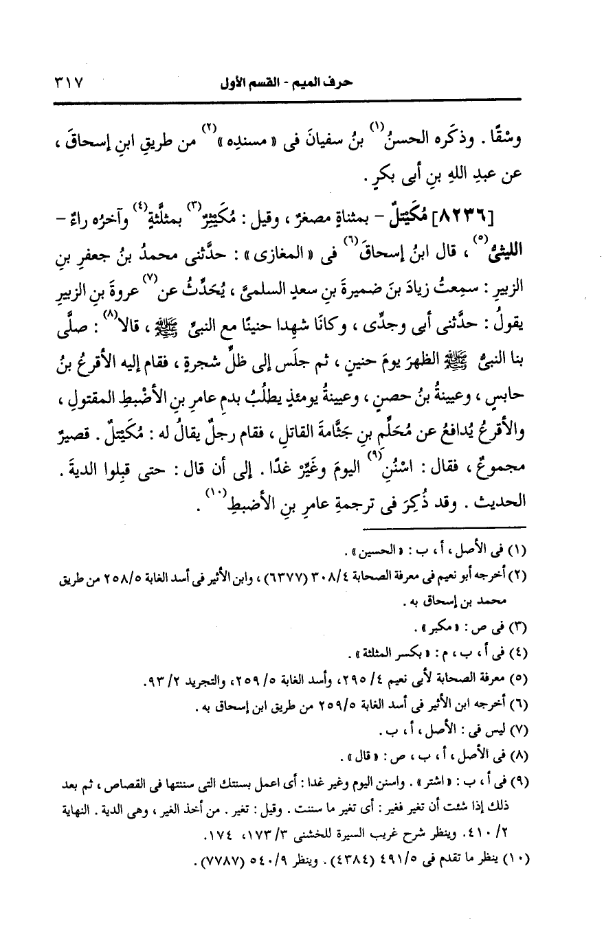 قال ابن إسحاق في المغازي حدثني محمد بن جعفر بن الزبير سمعت زياد بن ضميرة ابن سعد السلمي يحدث، عَن عُروَة بن الزبير يقول حدثني أبي وجدي وكانا شهدا حنينا مع النَّبيّ صَلى الله عَلَيه وسَلم قالا صلى بنا النَّبيّ صَلى الله عَلَيه وسَلم الظهر يوم حنين ثم جلس إلى ظل شجرة فقام إليه الأقرع بن حابس وعيينة بن حصن وعيينة يومئذ يطلب بدم عامر بن الأضبط المقتول والأقرع يدافع، عَن محلم بن جثامة القاتل فقام رجل يُقَالُ لَهُ: مكيتل قصير مجموع فقال أسس اليوم وغير غدا إلى أن قال حتى قبلوا الدية ...الحديث.