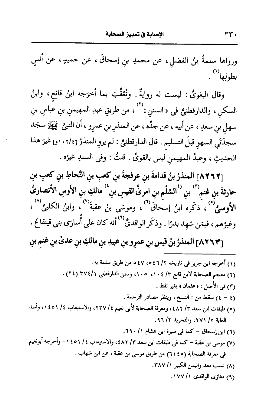 8262- المنذر بن قدامة بن عرفجة بن كعب بن النحاط بن كعب بن حارثة بن غنم بن مالك بن الأوس، الأَنصارِيّ الأوسي.