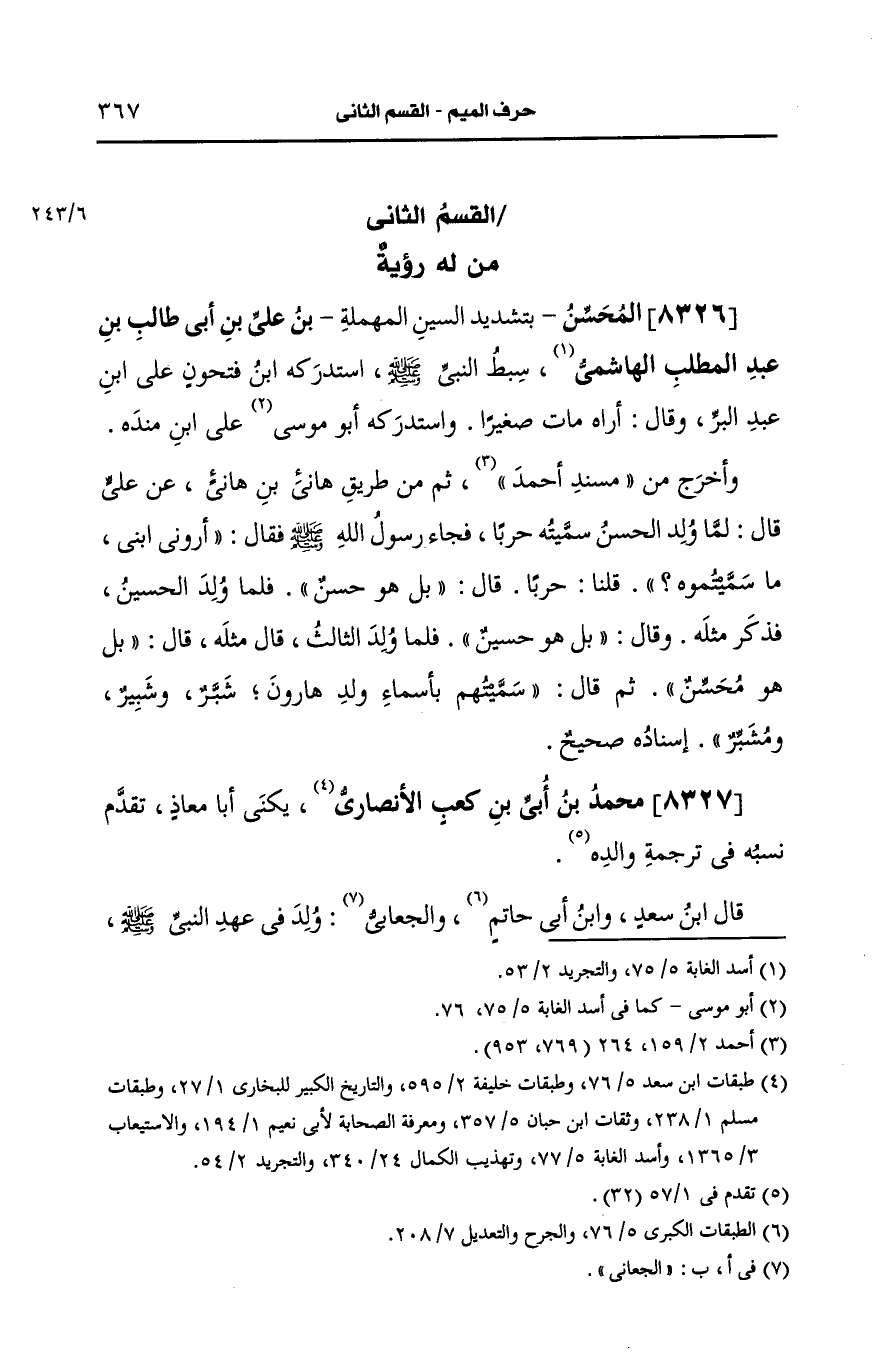 واستدركه أَبو موسى على ابن مَنْدَه وأخرج من مسند أَحمد ثم من طريق هانئ بن هانئ، عَن علي قال لما ولد الحسن سميته حربا فجاء رسول الله صَلى الله عَلَيه وسَلم فقال "أروني ابني ما سميتموه" ؟ قلنا:حربا قال بل هو حسن فلما ولد الحسين فذكر مثله وقال بل هو حسين فلما ولد الثالث قال مثله وقال بل هو محسن ثم قال سميتهم بأسماء ولد هارون شبر وشبير ومشبر إسناده صحيح.