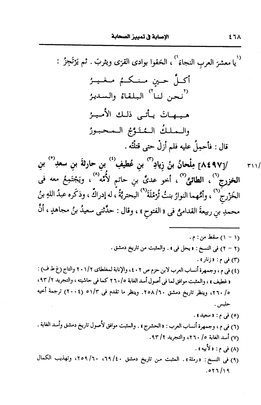 8497- ملحان بن زنار بن غطيف بن حارثة بن سعيد بن حشرج الطائي.