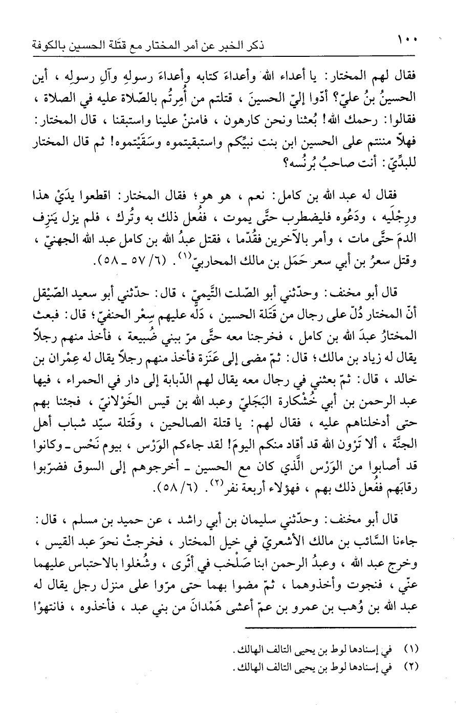 قال أبو مخنف: وحدّثني أبو الصّلت التَّيميّ، قال: حدّثني أبو سعيد الصّيْقل أنّ المختار دُلّ على رجال من قَتَلة الحسين، دَلَّه عليهم سِعْر الحنفيّ؛ قال: فبعث المختارُ عبدَ الله بن كامل، فخرجنا معه حتَّى مرّ ببني ضُبيعة، فأخذ منهم رجلًا يقال له زياد بن مالك؛ قال: ثمّ مضى إلى عَنَزة فأخذ منهم رجلًا يقال له عِمْران بن خالد، قال: ثمّ بعثني في رجال معه يقال لهم الدّبابة إلى دار في الحمراء، فيها عبد الرحمن بن أبي خُشْكارة البَجَليّ وعبد الله بن قيس الخَوْلانيّ، فجئنا بهم حتى أدخلناهم عليه، فقال لهم: يا قتلة الصالحين، وقَتلة سيّد شباب أهل الجنَّة، ألا ترون الله قد أقاد منكم اليومَ! لقد جاءكم الوَرْس، بيوم نَحْس - وكانوا قد أصابوا من الوَرْس الَّذي كان مع الحسين - أخرجوهم إلى السوق فضرّبوا رقابَهم ففُعل ذلك بهم، فهؤلاء أربعة نفر (٢). (٦/ ٥٨).