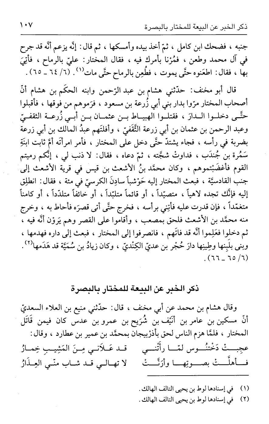جنبه، فضحك ابن كامل، ثمّ أخذ بيده وأمسكها، ثم قال: إنَّه يزعم أنَّه قد جرح في آل محمد وطعن، فمُرْنا بأمرك فيه، فقال المختار: عليّ بالرماح، فأتِيَ بها، فقال: اطعَنوه حتَّى يموت، فطُعِن بالرماح حتَّى مات (١). (٦/ ٦٤ - ٦٥).