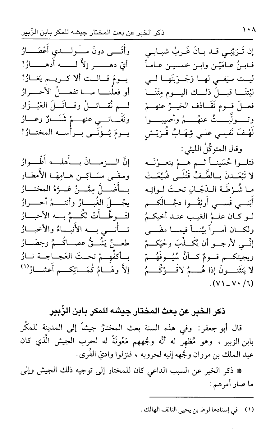قال أبو جعفر: وفي هذه السنة بعث المختارُ جيشًا إلى المدينة للمكْر بابن الزبير، وهو مُظهِر له أنَّه وجَّههم مَعُونَةً له لحرب الجيش الَّذي كان عبد الملك بن مروان وجَّهه إليه لحروبه، فنزلوا واديَ القُرى.