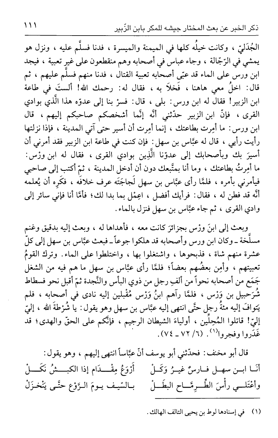الجُدَليّ، وكانت خيلُه كلها في الميمنة والميسرة، فدنا فسلَّم عليه، ونزل هو يمشي في الرّجّالة، وجاء عباس في أصحابه وهم منقطعون على غير تعبية، فيجد ابن ورس على الماء قد عبّى أصحابه تعبية القتال، فدنا منهم فسلَّم عليهم، ثم قال: اخلُ معي هاهنا، فَخلَا به، فقال له: رحمك الله! ألستَ في طاعة ابن الزبير! فقال له ابن ورس: بلى، قال: فسرْ بنا إلى عدوّه هذا الَّذي بوادي القرى، فإنّ ابن الزبير حدّثني أنَّه إنَّما أشخصكم صاحبكم إليهم، قال ابن ورس: ما أمِرت بطاعتك، إنما أمِرت أن أسير حتى آتي المدينة، فإذا نزلتها رأيت رأيي، قال له عبَّاس بن سهل: فإن كنت في طاعة ابن الزبير فقد أمرني أن أسيرَ بك وبأصحابك إلى عدوّنا الَّذِين بوادي القرى، فقال له ابن ورْس: ما أمِرتُ بطاعتك، وما أنا بمتَّبعك دون أن أدخل المدينة، ثمَّ أكتب إلى صاحبي فيأمرني بأمره، فلمَّا رأى عبَّاس بن سهل لَجاجَتَه عرف خلافَه، فكَرِه أن يُعلمه أنَّه قد فطن له، فقال: فرأيك أفضل، اعمْل بما بدا لك؛ فأمَّا أنا فإني سائر إلى وادي القرى، ثم جاء عبَّاس بن سهل فنزل بالماء.