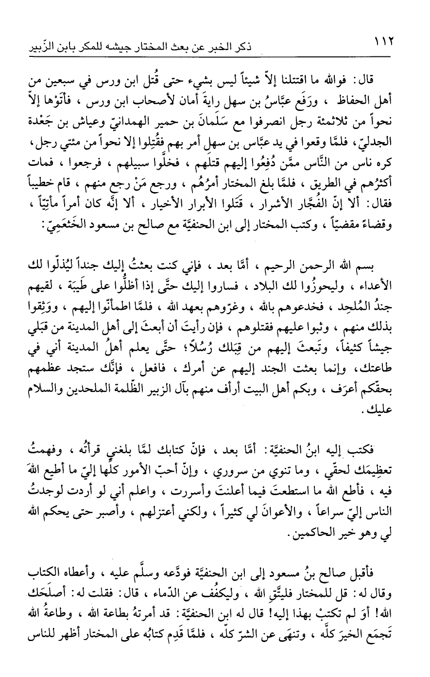 فأقبل صالح بنُ مسعود إلى ابن الحنفيَّة فودَّعه وسلَّم عليه، وأعطاه الكتاب وقال له: قل للمختار فليتَّقِ الله، وليكفُف عن الدّماء، قال: فقلت له: أصلَحَك الله! أوَ لم تكتبْ بهذا إليه! قال له ابن الحنفيَّة: قد أمرتهُ بطاعة الله، وطاعةُ الله تَجمَع الخيرَ كلَّه، وتنهَى عن الشرّ كلّه، فلمَّا قَدِم كتابُه على المختار أظهر للناس