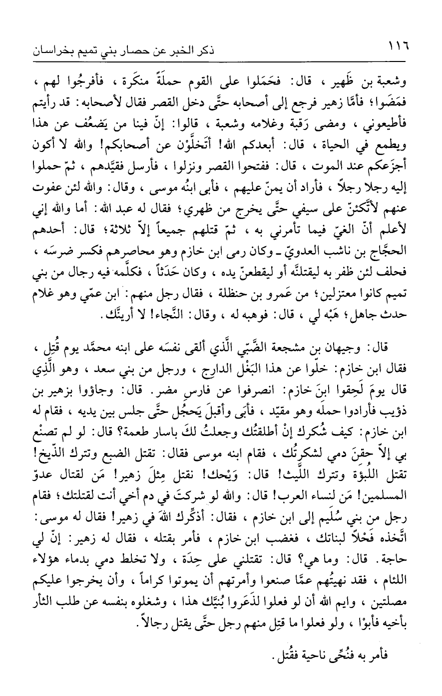 وشعبة بن ظَهير، قال: فحَمَلوا على القوم حملَةً منكَرة، فأفرجُوا لهم، فمَضوا؛ فأمَّا زهير فرجع إلى أصحابه حتَّى دخل القصر فقال لأصحابه: قد رأيتم فأطيعوني، ومضى رَقبة وغلامه وشعبة، قالوا: إنّ فينا من يَضعُف عن هذا ويطمع في الحياة، قال: أبعدكم الله! أتَخلَّوْن عن أصحابكم! والله لا أكون أجزَعكم عند الموت، قال: ففتحوا القصر ونزلوا، فأرسل فقيَّدهم، ثمّ حملوا إليه رجلا رجلًا، فأراد أن يمنّ عليهم، فأبى ابنُه موسى، وقال: والله لئن عفوت عنهم لأتَّكئنّ على سيفي حتَّى يخرج من ظهري؛ فقال له عبد الله: أما والله إني لأعلم أنّ الغيّ فيما تأمرني به، ثمّ قتلهم جميعًا إلّا ثلاثة؛ قال: أحدهم الحجَّاج بن ناشب العدويّ - وكان رمى ابن خازم وهو محاصرهم فكسر ضرسَه، فحلف لئن ظفر به ليقتلنَّه أو ليقطعنّ يده، وكان حَدَثًا، فكلَّمه فيه رجال من بني تميم كانوا معتزلين؛ من عَمرو بن حنظلة، فقال رجل منهم: ابن عمّي وهو غلام حدث جاهل؛ هَبْه لي، قال: فوهبه له، وقال: النَّجاء! لا أرينَّك.