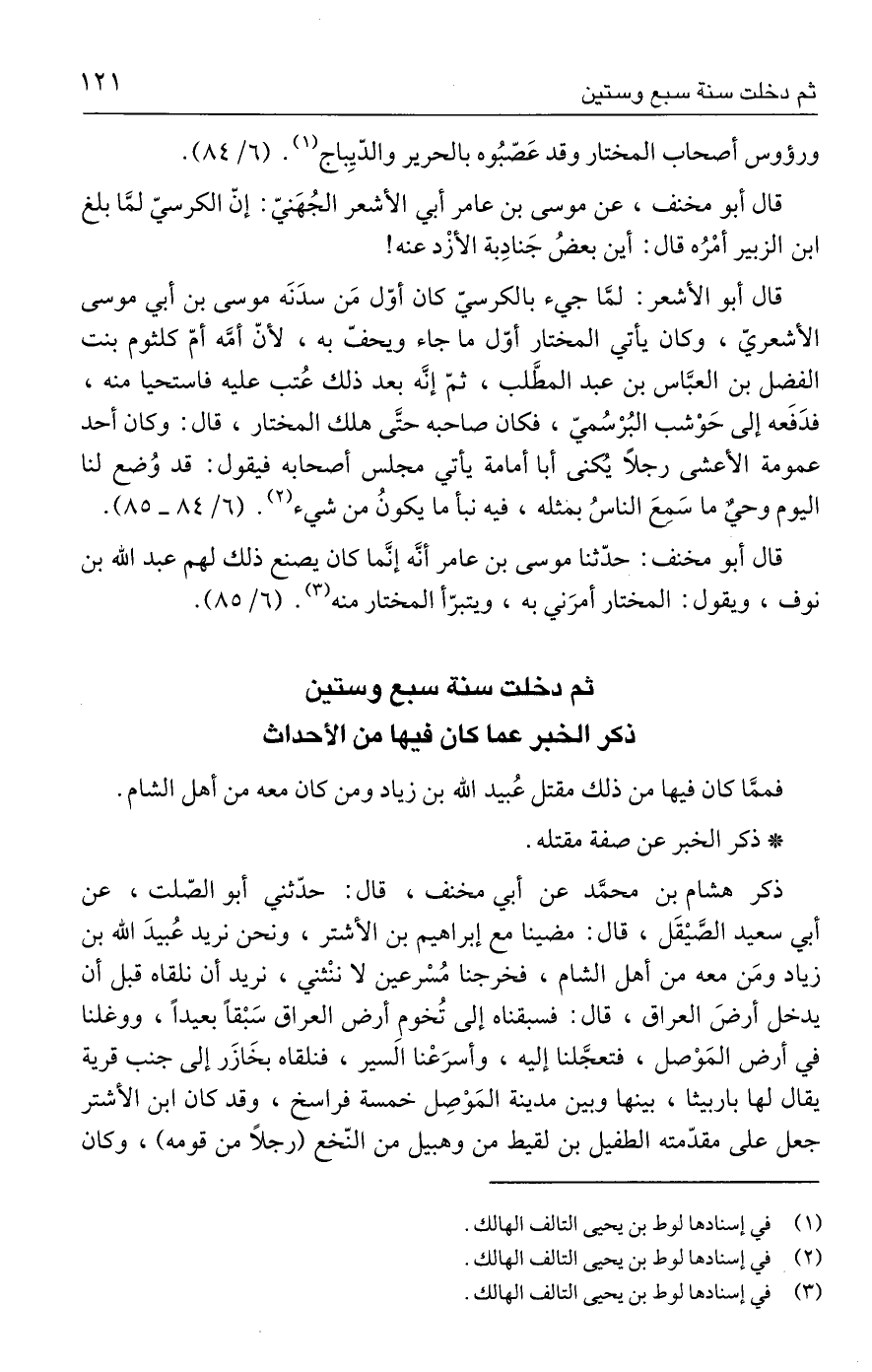 قال أبو مخنف: حدّثنا موسى بن عامر أنَّه إنَّما كان يصنع ذلك لهم عبد الله بن نوف، ويقول: المختار أمرَني به، ويتبرّأ المختار منه (٣). (٦/ ٨٥).