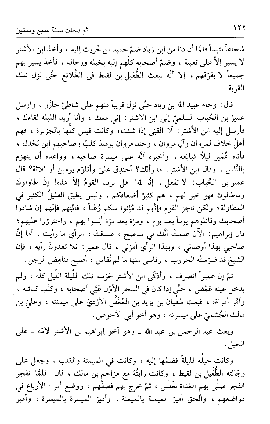 شجاعًا بئيسًا فلمَّا أن دنا من ابن زياد ضمّ حميد بن حُريث إليه، وأخذ ابن الأشتر لا يسير إلّا على تعبية، وضمّ أصحابه كلّهم إليه بخيله ورجاله، فأخذ يسير بهم جميعًا لا يفرّقهم، إلا أنَّه يبعث الطُفيل بن لقيط في الطَّلائع حتَّى نزل تلك القرية.