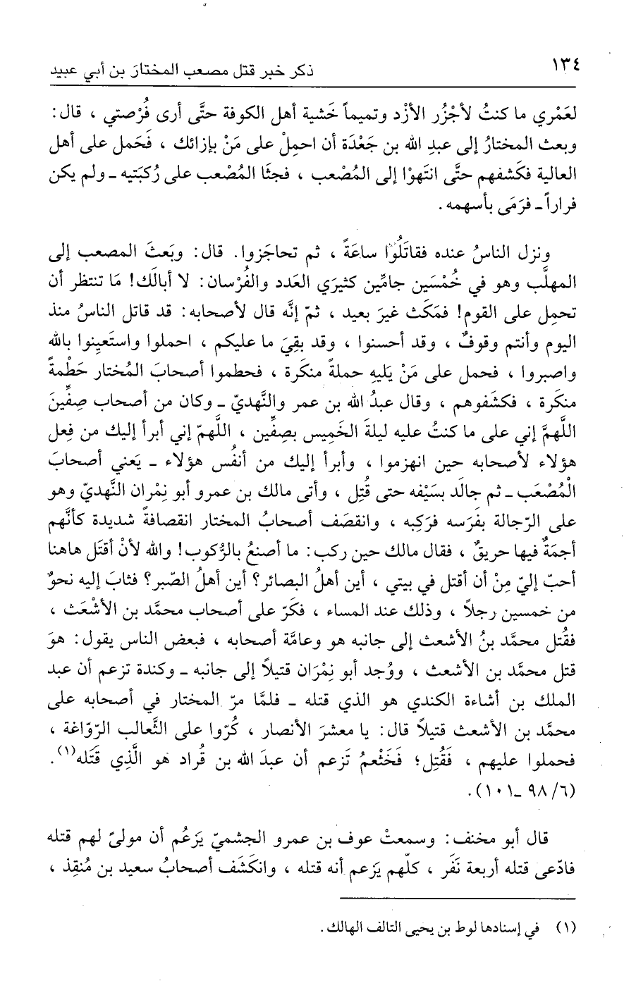 ونزل الناسُ عنده فقاتَلُوا ساعَةً، ثم تحاجَزوا. قال: وبَعثَ المصعب إلى المهلَّب وهو في خُمْسَين جامِّين كثيرَي العَدد والفُرْسان: لا أبالَك! مَا تنتظر أن تحمِل على القوم! فمَكَث غيرَ بعيد، ثمّ إنَّه قال لأصحابه: قد قاتل الناسُ منذ اليوم وأنتم وقوف، وقد أحسنوا، وقد بقِيَ ما عليكم، احملوا واستَعيِنوا بالله واصبروا، فحمل على مَنْ يَليهِ حملةً منكَرة، فحطموا أصحابَ المُختار حَطْمةً منكَرة، فكشَفوهم، وقال عبدُ الله بن عمر والنَّهديّ - وكان من أصحاب صفِّينَ اللَّهمَّ إني على ما كنتُ عليه ليلةَ الخَمِيس بصِفِّين، اللَّهمّ إني أبرأ إليك من فِعل هؤلاء لأصحابه حين انهزموا، وأبرأ إليك من أنفُس هؤلاء - يَعني أصحابَ الْمُصْعَب - ثم جالَد بسَيْفه حتى قُتِل، وأتى مالك بن عمرو أبو نِمْران النَّهديّ وهو على الرّجالة بفَرَسه فرَكِبه، وانقصَف أصحابُ المختار انقصافةً شديدة كأنَّهم أجمَةٌ فيها حريقٌ، فقال مالك حين ركب: ما أصنعُ بالرُّكوب! والله لأنْ أقتَل هاهنا أحبّ إليّ مِنْ أن أقتل في بيتي، أين أهلُ البصائر؟ أين أهلُ الصّبر؟ فثابَ إليه نحوٌ من خمسين رجلًا، وذلك عند المساء، فكَرّ على أصحاب محمَّد بن الأشْعَث، فقُتل محمَّد بنُ الأشعث إلى جانبه هو وعامَّة أصحابه، فبعض الناس يقول: هوَ قتل محمَّد بن الأشعث، ووُجد أبو نِمْرَان قتيلًا إلى جانبه - وكندة تزعم أن عبد الملك بن أشاءة الكندي هو الذي قتله - فلمَّا مرّ المختار في أصحابه على محمَّد بن الأشعث قتيلًا قال: يا معشرَ الأنصار، كُرّوا على الثَّعالب الرّوّاغة، فحملوا عليهم، فَقُتِل؛ فَخَثْعمُ تَزعم أن عبدَ الله بن قُراد هو الَّذِي قتَله (١). (٦/ ٩٨ - ١٠١).