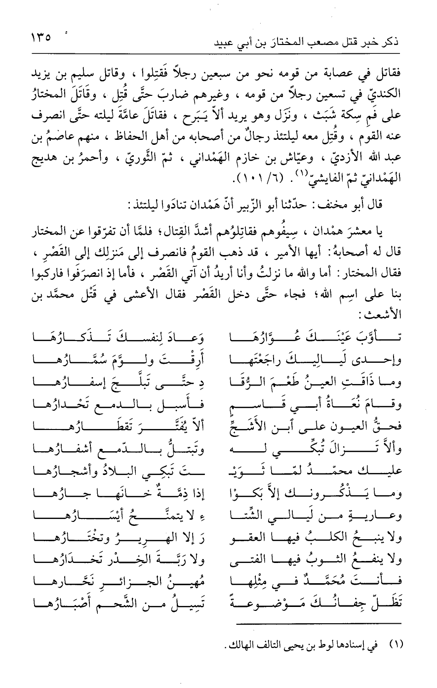 فقاتل في عصابة من قومه نحو من سبعين رجلًا فَقتِلوا، وقاتل سليم بن يزيد الكنديِّ في تسعين رجلًا مَن قومه، وغيرهم ضاربَ حتَّى قُتِل، وقَاتَلَ المختارُ على فمِ سِكة شَبَث، ونزَل وهو يريد ألّا يَبَرح، فقاتَلَ عامَّةَ ليلته حتَّى انصرف عنه القوم، وقُتِل معه ليلتئذ رجالٌ من أصحابه من أهل الحفاظ، منهم عاصمُ بن عبد الله الأزديّ، وعيّاش بن خازم الهَمْداني، ثمّ الثَّوريّ، وأحمرُ بن هديج الهَمْدانيّ ثمّ الفايشيّ (١). (٦/ ١٥١).